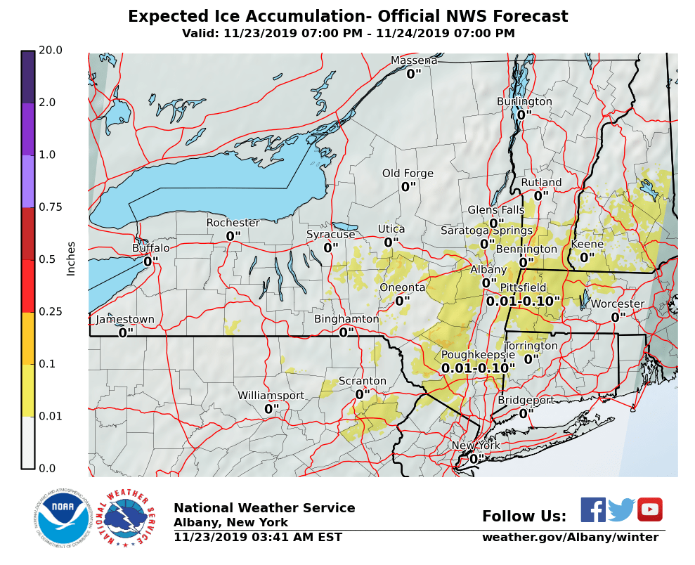 **** The information in this email pertains to the following areas only:**** *- In Connecticut: Litchfield County* *- In Massachusetts: Berkshire County* *- In Vermont: Bennington & Windham Counties* *- In New York: Albany, Columbia, Dutchess, Fulton, Hamilton, Herkimer, Montgomery, Greene, Rensselaer, Saratoga, Schenectady, Schoharie, Ulster, Warren and Washington Counties* Dear Emergency Managers and other partners, A storm system will impact the area late tonight into Sunday. A wintry mix of snow, sleet and freezing rain are possible, mainly southeast of the Adirondacks. Expected snow and ice amounts are attached, that will be adjusted periodically through today as new data and guidance are available. If confidence increases for higher snow and ice amounts, then winter weather advisories may be needed for some locations later today. See attached images for ice and snow accumulations over this weekend. If you have any questions, please feel free to contact us via: 1. Email: alb.stormreport@noaa.gov 2. NWSChat at https://nwschat.weather.gov/live/ 3. Social Media: Facebook <https://www.facebook.com/NWSAlbany> and Twitter <https://twitter.com/NWSAlbany> 4. Telephone: (518) 435-9575 <518-435-9575>