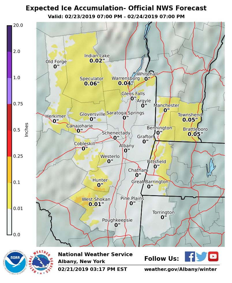 **** The information in this email pertains to the following areas only:**** *- In Connecticut: Litchfield County* *- In Massachusetts: Berkshire County* *- In Vermont: Bennington & Windham Counties* *- In New York: Albany, Columbia, Dutchess, Fulton, Hamilton, Herkimer, Montgomery, Greene, Rensselaer, Saratoga, Schenectady, Schoharie, Ulster, Warren and Washington Counties* Dear Emergency Managers and other partners, A low pressure system will approach the area on Saturday. This system will bring a wintry mix of snow, sleet and freezing rain Saturday night into early Sunday morning before changing over to all rain. Please see attached graphics for snowfall and ice accumulation forecasts. Additionally, strong winds will be possible Sunday night into Monday. The strongest winds are expected over the Mohawk Valley, Catskills, southern Capital Region, Taconics, southern Vermont and western Massachusetts, with strong to damaging wind gusts possible at times. Wind headlines will likely be needed. If you have any questions, please feel free to contact us via: 1. Email: alb.stormreport@noaa.gov 2. NWSChat at https://nwschat.weather.gov/live/ 3. Social Media: Facebook <https://www.facebook.com/NWSAlbany> and Twitter <https://twitter.com/NWSAlbany> 4. Telephone: (518) 435-9575 <518-435-9575> Sincerely, NWS Albany www.weather.gov/albany