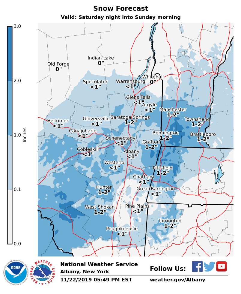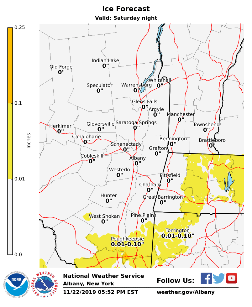 **** The information in this email pertains to the following areas only:**** *- In Connecticut: Litchfield County* *- In Massachusetts: Berkshire County* *- In Vermont: Bennington & Windham Counties* *- In New York: Albany, Columbia, Dutchess, Fulton, Hamilton, Herkimer, Montgomery, Greene, Rensselaer, Saratoga, Schenectady, Schoharie, Ulster, Warren and Washington Counties* Dear Emergency Managers and other partners, A storm system is forecast to impact the area late Saturday night into Sunday. A light wintry mix and or light snow accumulations are possible, mainly southeast of the Adirondacks. Expected snow and ice amounts are attached, that will be adjusted periodically through Saturday as new data and guidance are available. If confidence increases for higher snow and ice amounts, then winter weather advisories may be needed for some locations. See attached images for ice and snow accumulations over the weekend. If you have any questions, please feel free to contact us via: 1. Email: alb.stormreport@noaa.gov 2. NWSChat at https://nwschat.weather.gov/live/ 3. Social Media: Facebook <https://www.facebook.com/NWSAlbany> and Twitter <https://twitter.com/NWSAlbany> 4. Telephone: (518) 435-9575 <518-435-9575>