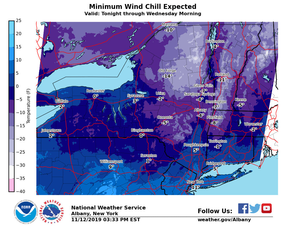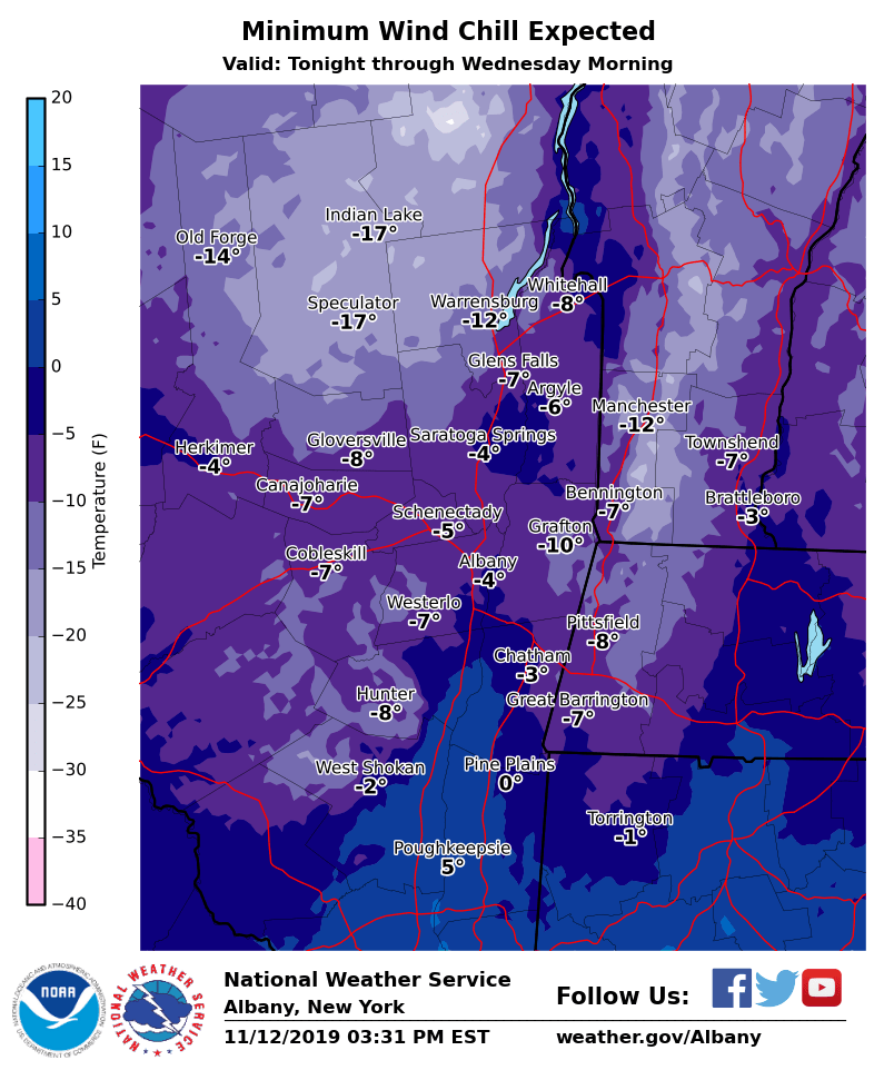**** The information in this email pertains to the following areas only:**** *- In Connecticut: Litchfield County* *- In Massachusetts: Berkshire County* *- In Vermont: Bennington & Windham Counties* *- In New York: Albany, Columbia, Dutchess, Fulton, Hamilton, Herkimer, Montgomery, Greene, Rensselaer, Saratoga, Schenectady, Schoharie, Ulster, Warren and Washington Counties* Dear Emergency Managers and other partners, Record breaking cold temperatures are expected tonight, as temperatures tumble into the single digits and teens, with around zero degrees across the southern Adirondacks. Across the southern Adirondacks, wind chills may drop to as low as 15 to 20 degrees below zero overnight into Wednesday morning. Elsewhere, wind chills will drop to between zero and 10 degrees below zero. In addition, a few snow squalls are possible this evening down the Mohawk Valley, Schoharie County and Helderbergs, Capital District into the Taconics and Berkshires. Please refer to the attached images for more specific details on forecast low temperatures and wind chills tonight. If you have any questions, please feel free to contact us via: 1. Email: alb.stormreport@noaa.gov 2. NWSChat at https://nwschat.weather.gov/live/ 3. Social Media: Facebook <https://www.facebook.com/NWSAlbany> and Twitter <https://twitter.com/NWSAlbany> 4. Telephone: (518) 435-9575 <518-435-9575> Sincerely, NWS Albany www.weather.gov/albany