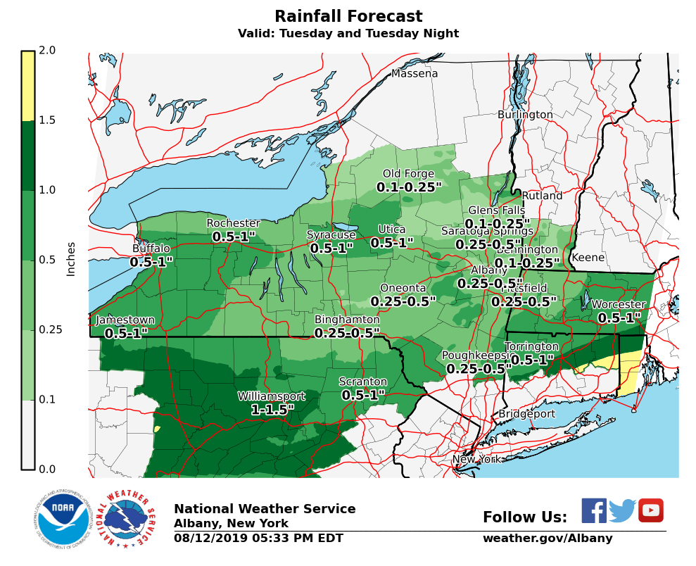**** The information in this email pertains to the following areas only:**** *- In Connecticut: Litchfield County* *- In Massachusetts: Berkshire County* *- In Vermont: Bennington & Windham Counties* *- In New York: Albany, Columbia, Dutchess, Fulton, Hamilton, Herkimer, Montgomery, Greene, Rensselaer, Saratoga, Schenectady, Schoharie, Ulster, Warren and Washington Counties* Dear Emergency Managers and other partners, It will turn more humid for Tuesday with numerous showers and scattered thunderstorms. Thunderstorms will be capable of producing locally heavy rainfall which could lead to urban and poor drainage flooding along with isolated flash flooding a possibility across the southeast part of the Albany Forecast Area. The threat for severe thunderstorms is expected to be across southern Ulster, Dutchess and Litchfield Counties. Please refer to the attached graphics for Tuesday's Severe Weather Outlook, Tuesday's Excessive Rainfall Outlook and Rain Forecast for Tuesday and Tuesday night. If you have any questions, please feel free to contact us via: 1. Email: alb.stormreport@noaa.gov 2. NWSChat at https://nwschat.weather.gov/live/ 3. Social Media: Facebook <https://www.facebook.com/NWSAlbany> and Twitter <https://twitter.com/NWSAlbany> 4. Telephone: (518) 435-9575 <518-435-9575> Sincerely, NWS Albany www.weather.gov/albany