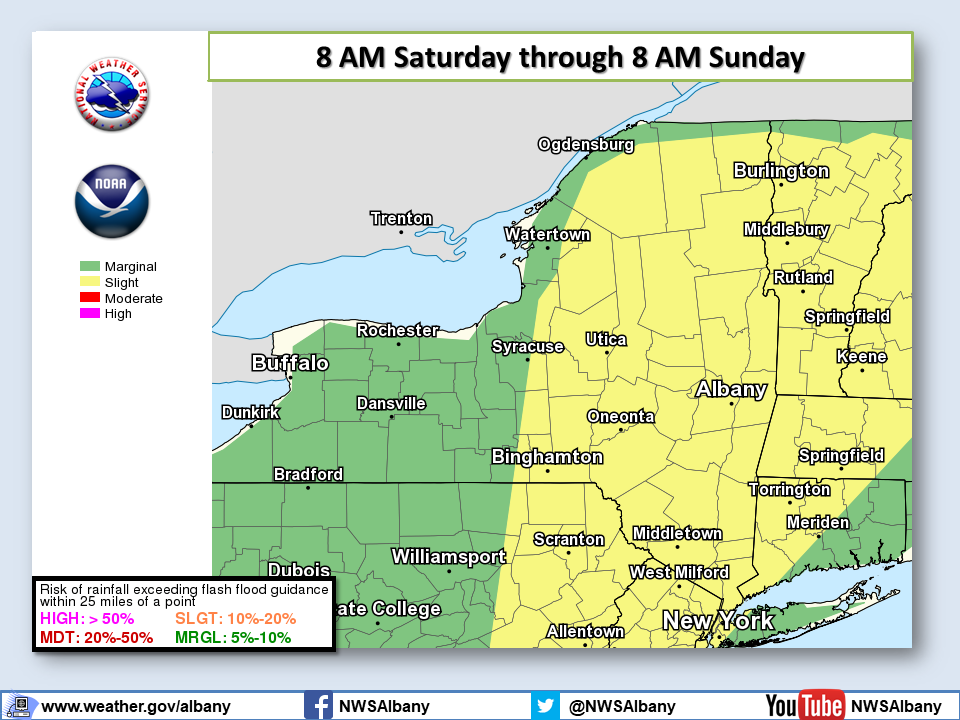 **** The information in this email pertains to the following areas only:**** *- In Connecticut: Litchfield County* *- In Massachusetts: Berkshire County* *- In Vermont: Bennington & Windham Counties* *- In New York: Albany, Columbia, Dutchess, Fulton, Hamilton, Herkimer, Montgomery, Greene, Rensselaer, Saratoga, Schenectady, Schoharie, Ulster, Warren and Washington Counties* Dear Emergency Managers and other partners, Happy Independence Day! *Heat and Heavy Rainfall Potential the next several days.* Our confidence in a three day period of hot temperatures and humid conditions extending from today July 4 to Saturday July 6 remains unchanged. Such conditions may produce dangerous heat conditions with heat index values reaching into the mid-90s in portions of the Hudson and Mohawk Valley. Humidity values are expected to be the highest on Saturday which means areas from the mid-Hudson Valley into the Greater Capital Region could see heat index values near 95F. Should confidence continue to increase, heat advisories will need to be issued. Heat safety tips and resources are available at: https://www.weather.gov/safety/heat (also linked from our web page) In addition to the heat, the chance for thunderstorms increases Friday into Saturday. Some thunderstorms may produce very heavy rainfall as our region has been highlighted within a 'Slight Risk' of excessive rainfall. See attached graphic for details. If you have any questions, please feel free to contact us via: 1. Email: alb.stormreport@noaa.gov 2. NWSChat at https://nwschat.weather.gov/live/ 3. Social Media: Facebook <https://www.facebook.com/NWSAlbany> and Twitter <https://twitter.com/NWSAlbany> 4. Telephone: (518) 435-9575 <518-435-9575> Sincerely, NWS Albany www.weather.gov/albany