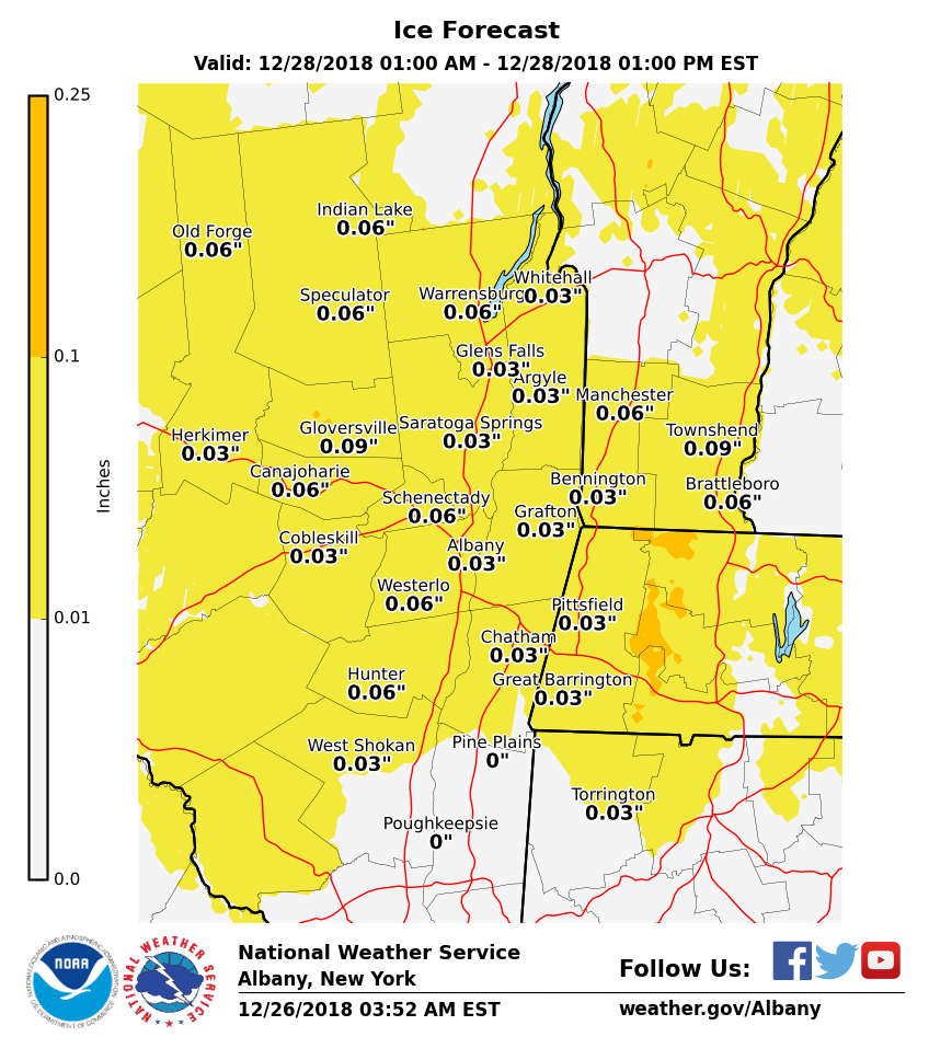 **** The information in this email pertains to the following areas only:**** *- In Connecticut: Litchfield County* *- In Massachusetts: Berkshire County* *- In Vermont: Bennington & Windham Counties* *- In New York: Albany, Columbia, Dutchess, Fulton, Hamilton, Herkimer, Montgomery, Greene, Rensselaer, Saratoga, Schenectady, Schoharie, Ulster, Warren and Washington Counties* Dear Emergency Managers and Other Partners, A storm system will be impacting the region for Thursday night into Friday. Precipitation will begin around midnight and initially be snow and sleet, but will quickly change to freezing rain during the late night hours. As temperatures continue to rise, precipitation will change to plain rain between 4 AM and 10 AM on Friday with the Adirondacks and southern Vermont taking the longest to changeover to plain rain. Across the entire area, snow and sleet accumulation will be an inch or less, along with a light glaze of ice. This wintry mix will make for hazardous driving and walking conditions, including during parts of the Friday morning commute. Attached is our current forecast amounts for snow and ice. If you have any questions, please feel free to contact us via: 1. Email: alb.stormreport@noaa.gov 2. NWSChat at https://nwschat.weather.gov/live/ 3. Social Media: Facebook <https://www.facebook.com/NWSAlbany> and Twitter <https://twitter.com/NWSAlbany> 4. Telephone: (518) 435-9575 <518-435-9575> Sincerely, NWS Albany www.weather.gov/albany
