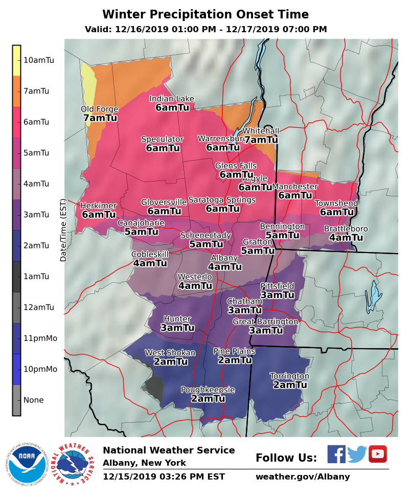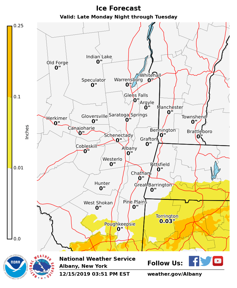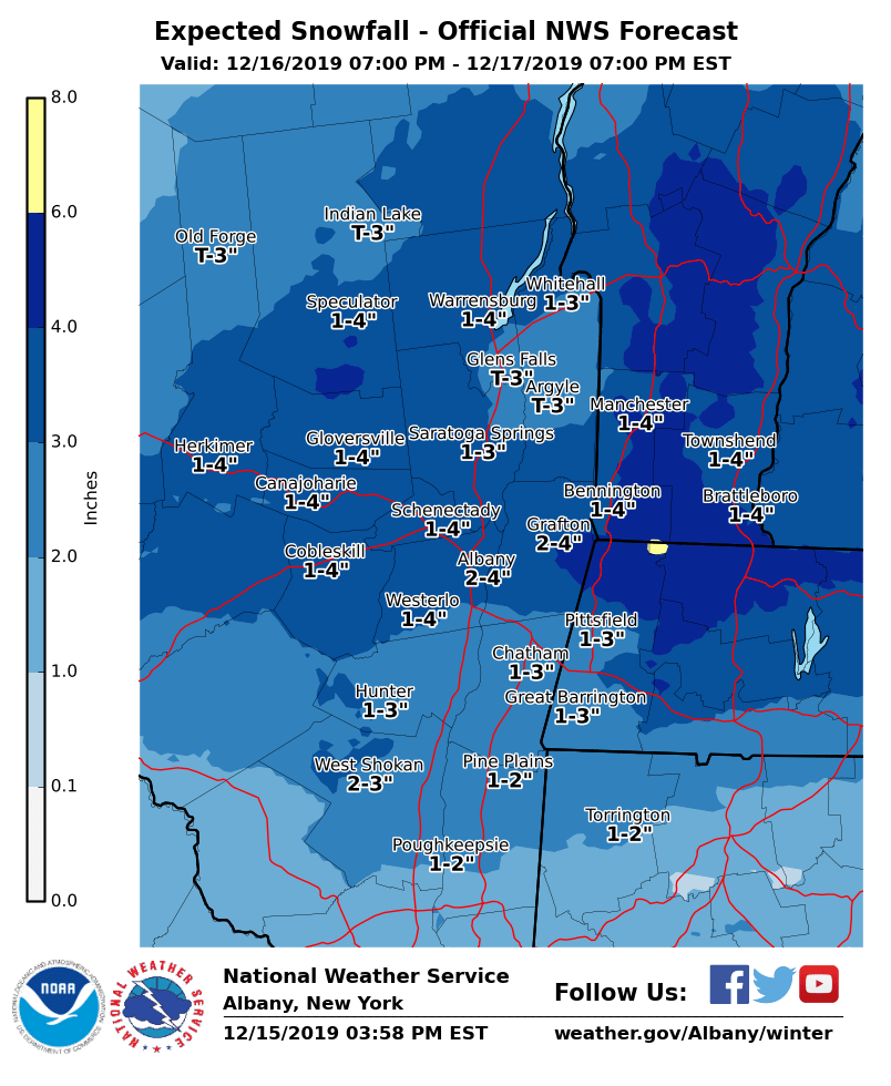 **** The information in this email pertains to the following areas only:**** *- In Connecticut: Litchfield County* *- In Massachusetts: Berkshire County* *- In Vermont: Bennington & Windham Counties* *- In New York: Albany, Columbia, Dutchess, Fulton, Hamilton, Herkimer, Montgomery, Greene, Rensselaer, Saratoga, Schenectady, Schoharie, Ulster, Warren and Washington Counties* Dear Emergency Managers and other partners, Several weather hazards are possible through the week. - A Wind Advisory remains in effect for portions of eastern New York and western New England through 7 PM today for the potential for 50 mph winds resulting in downed tree limbs and scattered power outages. - A storm system is expected to bring snow and a wintry mix to the region late Monday night into Tuesday. The best chance at seeing a wintry mix is south of Albany, with mostly snow favored from Albany north. Light to moderate accumulations of snow, sleet, and ice are possible, which could lead to difficult travel conditions. Winter weather advisories may be needed in some areas. - Snow squalls are possible on Wednesday, which could result in rapid changes in visibility and difficult travel conditions. - Bitter cold temperatures are possible Wednesday night through the end of the work week. Wind Chill Advisories may be needed for parts of the area. Please refer to the attached images for details. If you have any questions, please feel free to contact us via: 1. Email: alb.stormreport@noaa.gov 2. NWSChat at https://nwschat.weather.gov/live/ 3. Social Media: Facebook <https://www.facebook.com/NWSAlbany> and Twitter <https://twitter.com/NWSAlbany> 4. Telephone: (518) 435-9575 <518-435-9575> Sincerely, NWS Albany www.weather.gov/albany