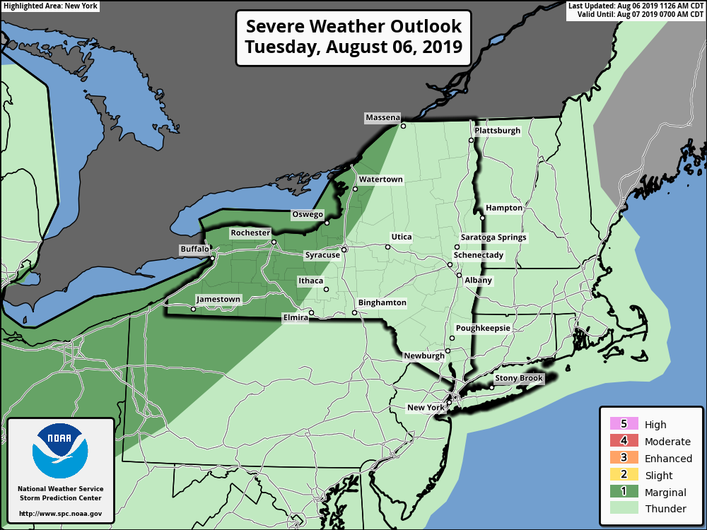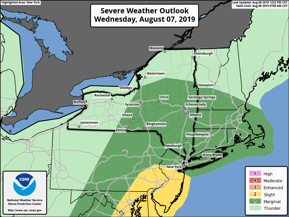 **** The information in this email pertains to the following areas only:**** *- In Connecticut: Litchfield County* *- In Massachusetts: Berkshire County* *- In Vermont: Bennington & Windham Counties* *- In New York: Albany, Columbia, Dutchess, Fulton, Hamilton, Herkimer, Montgomery, Greene, Rensselaer, Saratoga, Schenectady, Schoharie, Ulster, Warren and Washington Counties* Dear Emergency Managers and other partners, Thunderstorms capable of damaging winds are the primary weather hazard today through Thursday. Read below for details. *This Afternoon into Early this Evening:* We continue to monitor isolated to scattered thunderstorms this afternoon. While most of not been severe, a few have produced gusty winds and heavy rain. We will continue to monitor thunderstorms through this evening and issue Special Weather Statements and, if needed, any isolated Severe Thunderstorm Warnings. We do not anticipate widespread severe weather. *Wednesday August 7, 2019* A more favorable set-up for severe weather arrives tomorrow. The potential thunderstorms and severe weather exists mainly from midday through Midnight. The Storm Prediction Center has placed eastern NY and western New England in a "Marginal Risk" for severe weather. Damaging winds will again be the primary concern. Besides the potential for damaging winds, thunderstorms on Wednesday will also be capable of heavy rainfall that may lead to to ponding of water in low lying, urban and poor drainage areas. An isolated flash flood is possible and the latest Excessive Rainfall graphic has a "Marginal Risk" for our entire region to exceed flash flood guidance. *Thursday August 8, 2019* Scattered thunderstorms could occur once again Thursday afternoon and evening, some of which could contain strong wind gusts Please refer to the attached images for additional information. If you have any questions, please feel free to contact us via: 1. Email: alb.stormreport@noaa.gov 2. NWSChat at https://nwschat.weather.gov/live/ 3. Social Media: Facebook <https://www.facebook.com/NWSAlbany> and Twitter <https://twitter.com/NWSAlbany> 4. Telephone: (518) 435-9575 <518-435-9575> Sincerely, NWS Albany www.weather.gov/albany