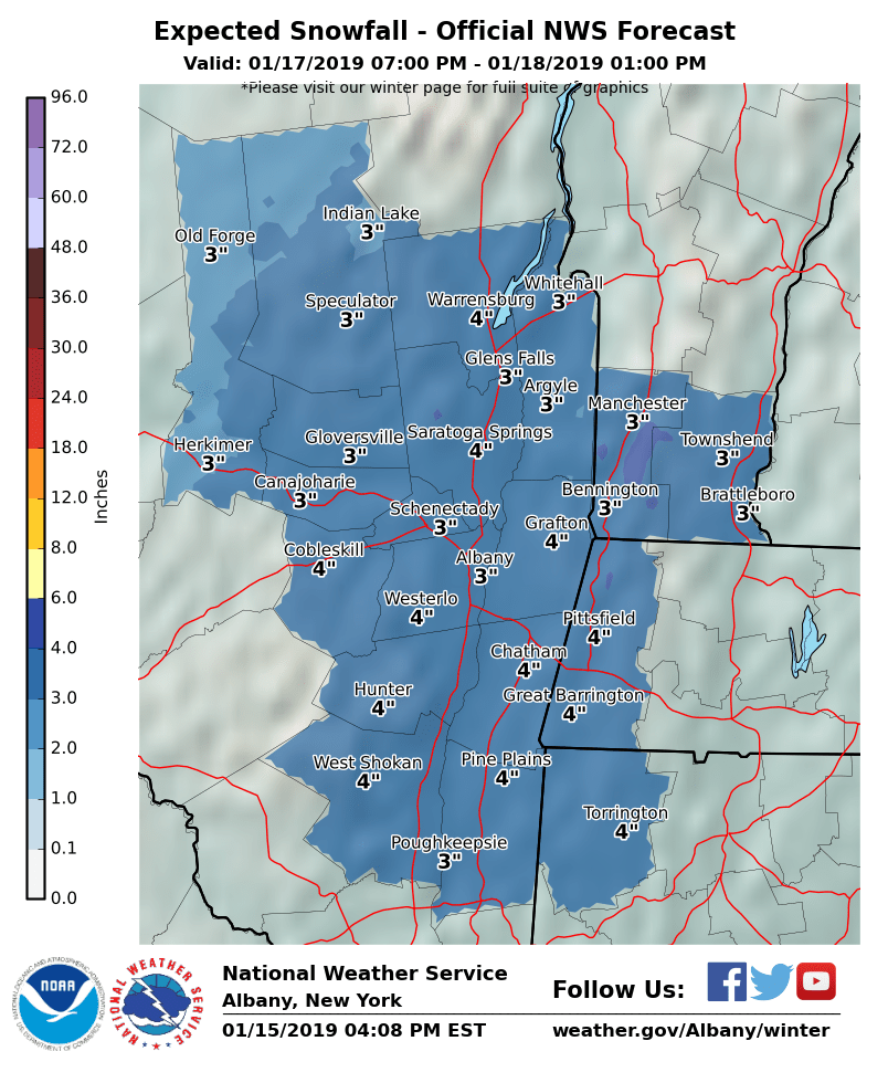 **** The information in this email pertains to the following areas only:**** *- In Connecticut: Litchfield County* *- In Massachusetts: Berkshire County* *- In Vermont: Bennington & Windham Counties* *- In New York: Albany, Columbia, Dutchess, Fulton, Hamilton, Herkimer, Montgomery, Greene, Rensselaer, Saratoga, Schenectady, Schoharie, Ulster, Warren and Washington Counties* Dear Emergency Managers and other partners, A *light snowfall is still expected Thursday night into Friday morning *which may impact the Friday morning commute. Expected snowfall map is attached. A *significant storm is expected impact the region this weekend* with a moderate to possibly heavy snowfall. There is still much uncertainty in the forecast, however at this time the time frame for impacts is Saturday afternoon into Sunday evening with the potential for a wintry mix of precipitation for areas south and east of the Capital District. A *dangerously cold air mass and well below zero wind chills* are possible Sunday into Monday in the wake of this storm. If you have any questions, please feel free to contact us via: 1. Email: alb.stormreport@noaa.gov 2. NWSChat at https://nwschat.weather.gov/live/ 3. Social Media: Facebook <https://www.facebook.com/NWSAlbany> and Twitter <https://twitter.com/NWSAlbany> 4. Telephone: (518) 435-9575 <518-435-9575> Sincerely, NWS Albany www.weather.gov/albany