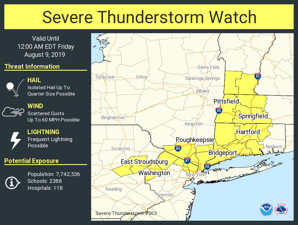 **** The information in this email pertains to the following areas only:**** *- In Connecticut: Litchfield County* *- In Massachusetts: Berkshire County* *- In Vermont: Bennington & Windham Counties* Dear Emergency Managers and other partners, Severe Thunderstorm Watch is in effect until MIDNIGHT for all of western New England. A line of thunderstorms continues to approach from eastern New York and will be capable of producing damaging winds and large hail. Please refer to the attached graphic for additional information. If you have any questions, please feel free to contact us via: 1. Email: alb.stormreport@noaa.gov 2. NWSChat at https://nwschat.weather.gov/live/ 3. Social Media: Facebook <https://www.facebook.com/NWSAlbany> and Twitter <https://twitter.com/NWSAlbany> 4. Telephone: (518) 435-9575 <518-435-9575>