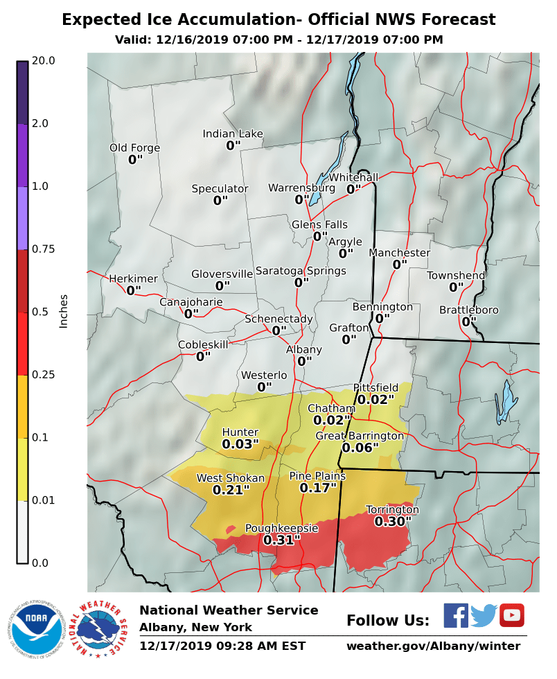 **** The information in this email pertains to the following areas only:**** *- In Connecticut: Litchfield County* *- In Massachusetts: Berkshire County* *- In Vermont: Bennington & Windham Counties* *- In New York: Albany, Columbia, Dutchess, Fulton, Hamilton, Herkimer, Montgomery, Greene, Rensselaer, Saratoga, Schenectady, Schoharie, Ulster, Warren and Washington Counties* Dear Emergency Managers and other partners, Please see attached images for updated forecast snow and ice forecast for the storm affecting our region today. Please note, ice accumulations have been increased to between a quarter and a third of an inch from around Kingston southward to Poughkeepsie, including southern Ulster, Dutchess and Litchfield Counties. If you have any questions, please feel free to contact us via: 1. Email: alb.stormreport@noaa.gov 2. NWSChat at https://nwschat.weather.gov/live/ 3. Social Media: Facebook <https://www.facebook.com/NWSAlbany> and Twitter <https://twitter.com/NWSAlbany> 4. Telephone: (518) 435-9575 <518-435-9575> Sincerely, NWS Albany www.weather.gov/albany