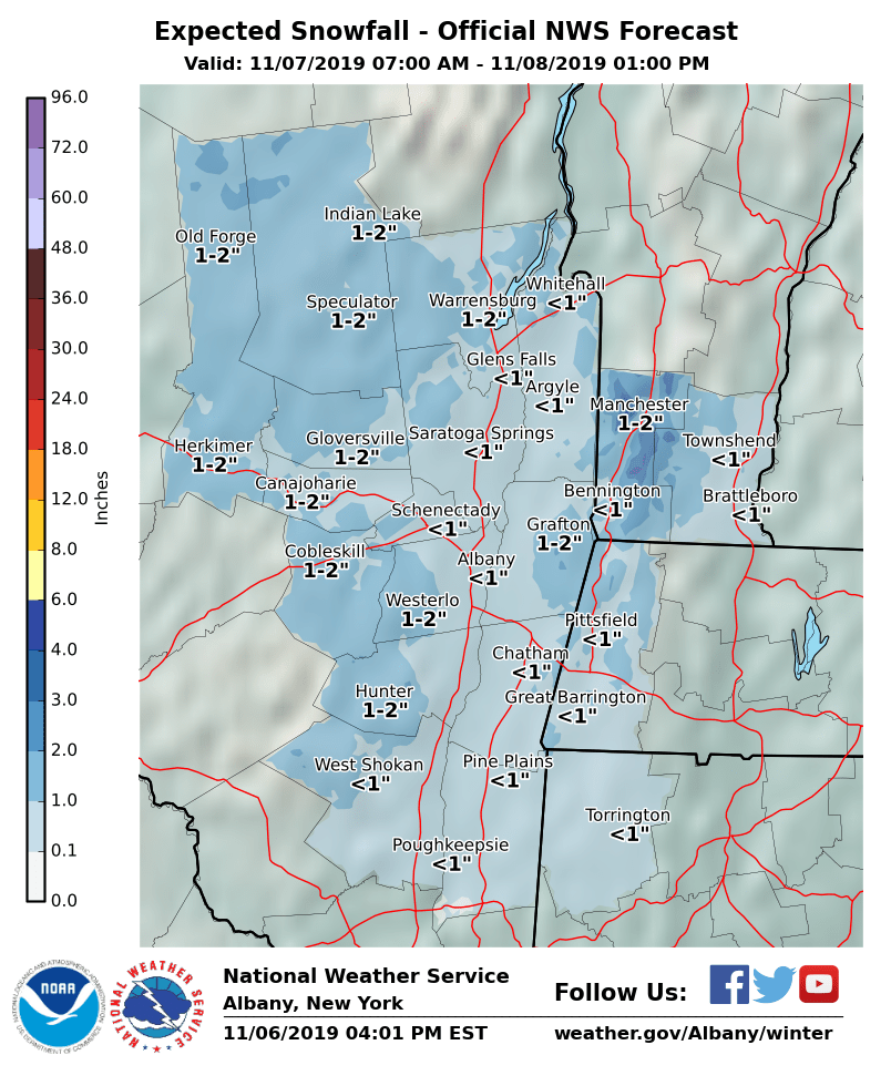 Dear Emergency Managers and other partners, A storm system is still expected to impact the region for Thursday into Thursday night. Initially, temperatures should be warm enough for the precipitation to fall as rain during the day on Thursday, although the Adirondacks may be cold enough for precipitation to begin as snow. Temperatures should cool quickly after sunset and allow rain to mix with and transition to wet snow for Thursday evening into Thursday night throughout all of eastern New York and western New England. Temperatures overnight are expected to cool below freezing across the entire region and therefore some wet snow accumulations are possible. Low temperatures are forecast to range from the upper teens over the high elevations to the mid to upper 20s in the valleys, so any residual moisture has the potential to freeze on surfaces. Precipitation will taper off by midnight for most of the area, with a cold and windy day likely for Friday. Storm total snow amounts are expected to be an inch or less for areas below 1500 foot elevation, with mainly 1-3" possible above 1500' in the southern Adirondacks, eastern Catskills, northern Taconics, southern Greens, and Berkshires. Please see the attached graphics for the latest forecast snowfall totals. If you have any questions, please feel free to contact us via: 1. Email: alb.stormreport@noaa.gov 2. NWSChat at https://nwschat.weather.gov/live/ 3. Social Media: Facebook <https://www.facebook.com/NWSAlbany> and Twitter <https://twitter.com/NWSAlbany> 4. Telephone: (518) 435-9575 <518-435-9575> Sincerely, NWS Albany www.weather.gov/albany
