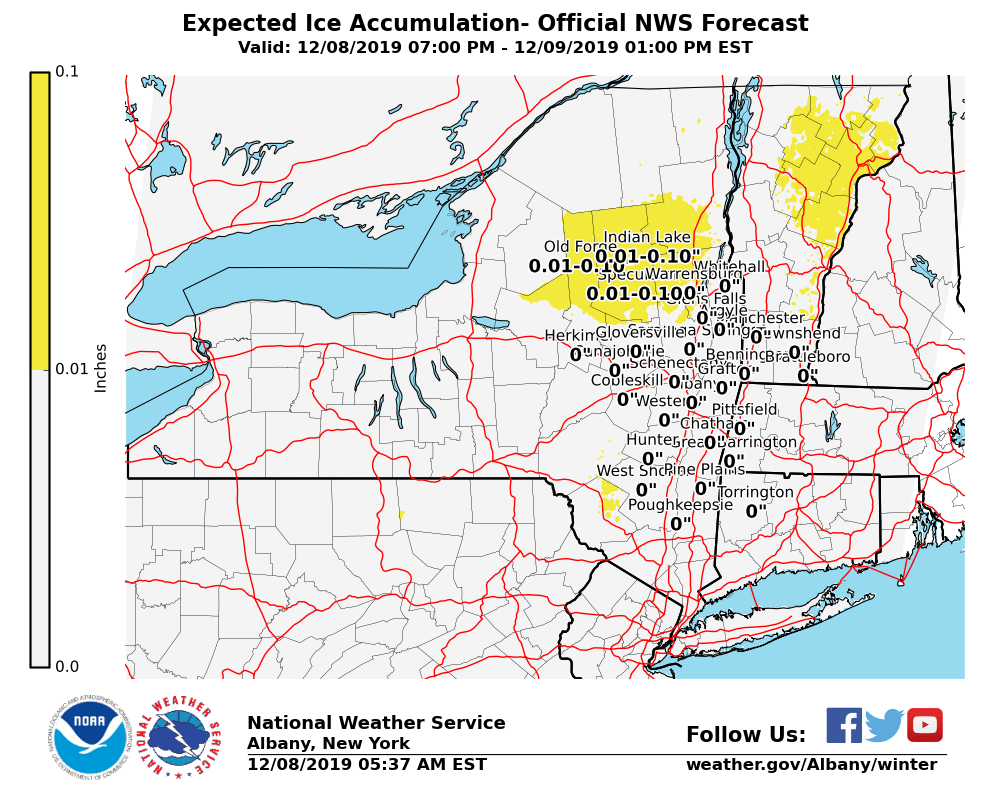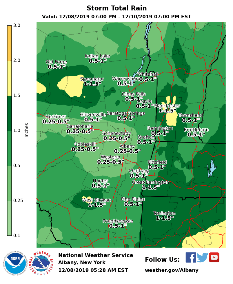 **** The information in this email pertains to the following areas only:**** *- In Connecticut: Litchfield County* *- In Massachusetts: Berkshire County* *- In Vermont: Bennington & Windham Counties* *- In New York: Albany, Columbia, Dutchess, Fulton, Hamilton, Herkimer, Montgomery, Greene, Rensselaer, Saratoga, Schenectady, Schoharie, Ulster, Warren and Washington Counties* Dear Emergency Managers and Other Partners, Mild temperatures and periods of rain are expected late tonight into Tuesday. The rain may begin as a wintry mix of sleet and freezing rain/drizzle for the southern Adirondacks tonight, with ice accretion less than a tenth of an inch expected (see ice graphic below). Roads may briefly become slippery Monday morning there. Temperatures are expected to rise above freezing later Monday morning. Around 0.50 to 1.70" rain is expected across eastern New York and western New England Sunday night into Tuesday (see expected rainfall graphic below). Wind and mild temperatures will likely result in some melting of the snowpack and runoff, which combined with runoff from the rainfall, will result in river rises. Widespread flooding is not expected at this time, but some rivers may reach flood stage. Some nuisance flooding is possible in urban and flood prone areas, especially where snow banks block storm drains. Rain is forecast to change back to snow Tuesday evening and some snow accumulation is expected Tuesday night. If you have any questions, please feel free to contact us via: 1. Email: alb.stormreport@noaa.gov 2. NWSChat at https://nwschat.weather.gov/live/ 3. Social Media: Facebook <https://www.facebook.com/NWSAlbany> and Twitter <https://twitter.com/NWSAlbany> 4. Telephone: (518) 435-9575 <518-435-9575> Sincerely, NWS Albany www.weather.gov/albany