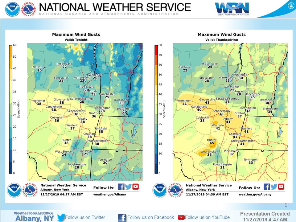**** The information in this email pertains to the following areas only:**** *- In Connecticut: Litchfield County* *- In Massachusetts: Berkshire County* *- In Vermont: Bennington & Windham Counties* *- In New York: Albany, Columbia, Dutchess, Fulton, Hamilton, Herkimer, Montgomery, Greene, Rensselaer, Saratoga, Schenectady, Schoharie, Ulster, Warren and Washington Counties* Dear Emergency Managers and other partners, Strong west to northwest winds gusting up to 35-45mph are expected tonight into Thanksgiving Day. The strongest winds are expected to occur from the Mohawk Valley into the Greater Capital District, Taconics and Berkshires as well as in the Catskills and southern Greens. If wind gusts in excess of 45 mph are expected then a wind advisory <https://www.weather.gov/media/aly/FactSheets/NYSWind.pdf> will be issued. Please refer to the attached slide "Tonight and Thanksgiving Wind Gusts" for details. Our next chance for a wintry mix of precipitation arrives Sunday into Monday. Uncertainty regarding the overall track/evolution and start time continues. Please refer to the attached slide "Sunday-Monday Snow" for the possibility for a plowable snowfall. If you have any questions, please feel free to contact us via: 1. Email: alb.stormreport@noaa.gov 2. NWSChat at https://nwschat.weather.gov/live/ 3. Social Media: Facebook <https://www.facebook.com/NWSAlbany> and Twitter <https://twitter.com/NWSAlbany> 4. Telephone: (518) 435-9575 <518-435-9575> Sincerely, NWS Albany www.weather.gov/albany