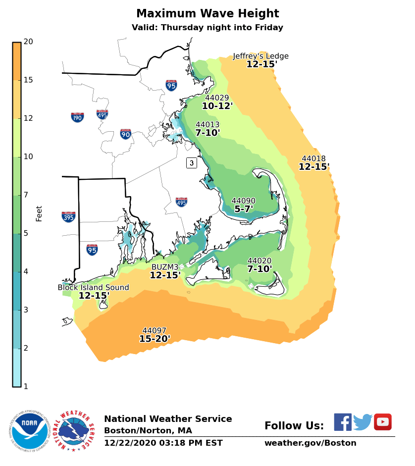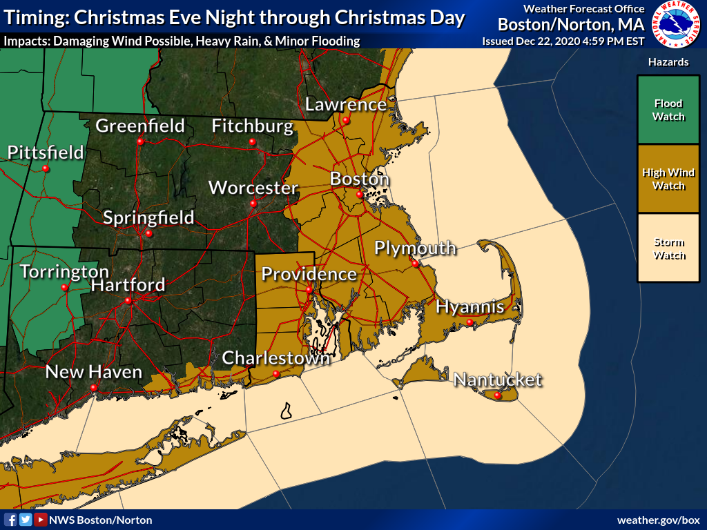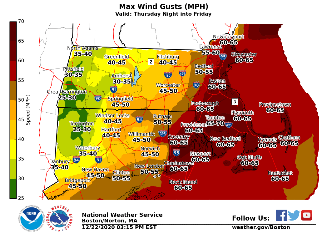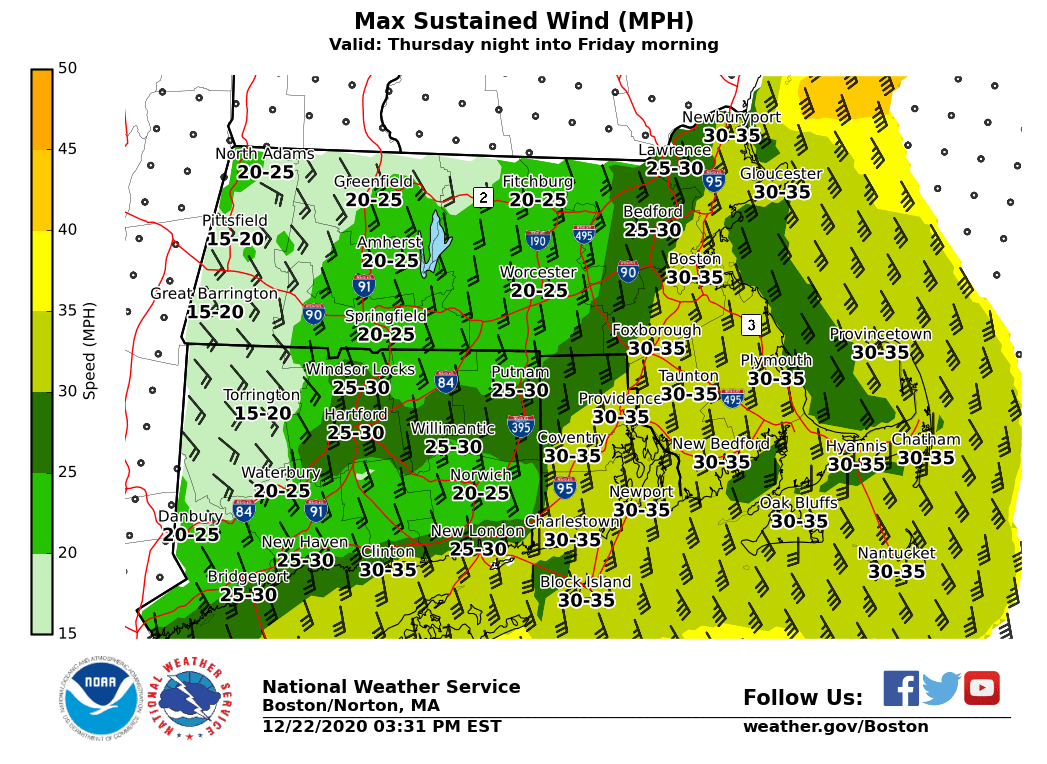 Good evening everyone, Unfortunately technical difficulties continue and precludes us from issuing our full graphics package. However here is an abbreviated version for now. We apologize for any inconvenience and will issue a full graphics briefing as soon as the technical issues have been resolved. *What has changed ...* ** *High Wind Watch in effect for all of RI & Eastern MA including coastal CT (Middlesex & New London) Thu night into midday Fri * Storm Watches for all RI and MA waters Thu night into Fri * Flood Watch for Litchfield county of CT and Berkshire county of MA *Damaging Winds/Power Outage Potential ... * * South to southeast winds 25 to 35 mph with gusts up to 65 mph possible Thu night into midday Fri. Strongest winds over RI and Eastern MA. Residents should prepare now for potential power outages. If forecast trends upward, a High Wind Watch may be extended westward into CT and central MA. *Heavy Rain & Potential Flooding ...* * Widespread 1-2 inches of rainfall expected with isolated amounts of 2.5-3.0 inches across RI, CT and into Western-Central MA. If forecast confidence increases on these higher rainfall amounts becoming more widespread, then a flood watch may be expanded. However, as of now a flood watch is only in effect for Litchfield and Berkshire counties. *Coastal Flooding ...* * Minor coastal flooding is possible along the south coast of MA and RI during the Friday morning high tide, which is around 4 am. Preliminary storm surge values of around 2 ft along the south coast of MA/RI, to upwards of 3 ft around Providence and New Bedford. This would result in minor coastal flooding. Strongest wind and surge are expected to occur after high tide, from about 7 am to 10 am. This would keep coastal flooding in the minor category. However, if the strongest winds and surge arrive earlier, there is a risk for more significant flooding. *Dense Fog ...* * Very warm/moist air with temperatures in the 50s to near 60 Christmas Eve night into Christmas morning, streaming across the snowpack may result in areas of dense fog, especially across Western-Central MA where snowpack will linger the longest. This would likely impact travel. Frank Nocera & Torry Gaucher If you have any questions or would like more information, don't hesitate to contact us via this email address, on NWSChat <https://nwschat.weather.gov/>, or at the following: National Weather Service Boston/Norton, MA 46 Commerce Way Norton, MA 02766 508.622.3280 Website <http://www.weather.gov/boston> | Facebook <http://www.facebook.com/NWSBoston> | Twitter <http://www.twitter.com/NWSBoston>