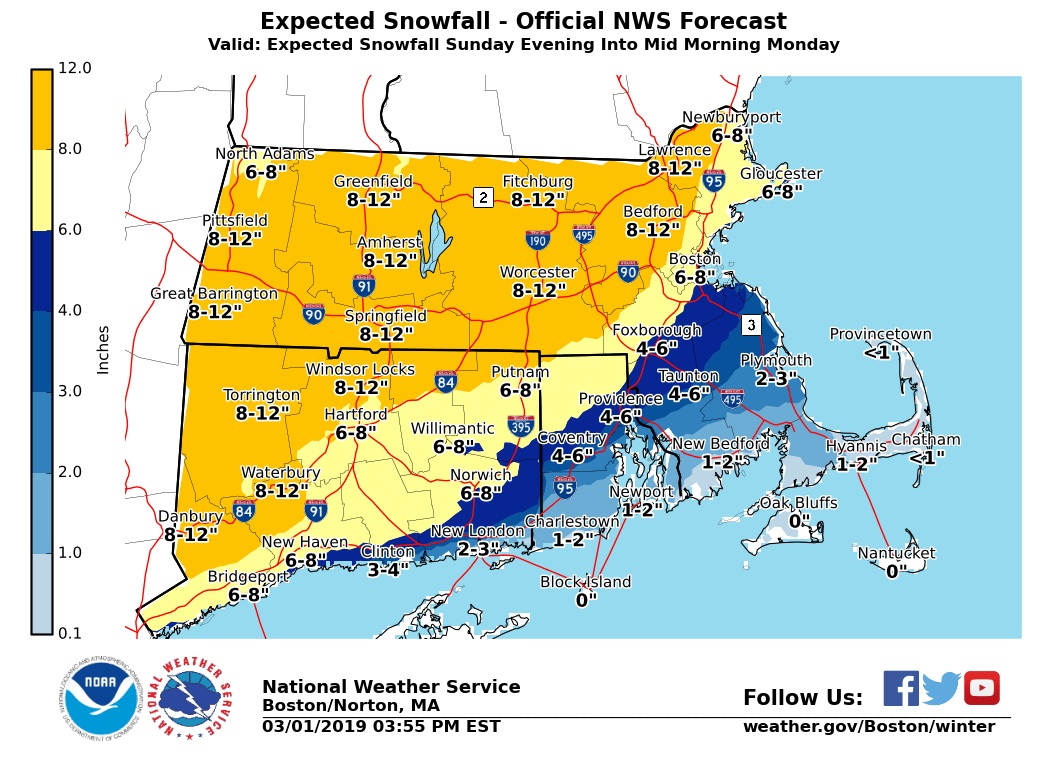 Good afternoon everyone Attached is our briefing package on the upcoming wet snow event overnight into Saturday. We have also included our snowfall forecast for the Sunday evening into mid morning Monday storm in second graphic. Lastly, please stay tuned for additional emails and another possible conference call sometime on Saturday. *Overnight Into Saturday:* What: - Wet Snow with accumulations of 2 to 6 inches across most of the region with 4 to 8 inches across Southeast MA. Lower amounts forecast on Cape Cod where some rain and sleet may be mixed in at times. Where: - All of southern New England with the heaviest snow expected across southeast MA into Rhode Island. When: - Snow develops from south to north after midnight. Heaviest snow expected from 4 am Saturday through noon with 1 inch per hour snowfall rates across RI and SE MA. Lighter snowfall continues Saturday afternoon. *Potential Impacts/Uncertainty: * *- *High confidence in a plowable snowfall for much of the region. - Main uncertainty is if higher snowfall amounts are realized, increasing the risk for isolated to scattered power outages. Greatest risk for this is across southeast MA and RI. - Lower confidence in snowfall amounts across the Cape and Islands with snow potentially mixing with rain and sleet. *Sunday Evening Into Mid Morning Monday:* *What:* - Significant snow accumulation possible. - Impacts to the Monday morning commute especially across the interior. - Risk for isolated to scattered power outages from northern CT into northwest RI and northeast MA if higher snow amounts are realized. *Where:* - Greatest risk for significant snow will be northwest of the Boston to Providence corridor, but significant snow is still possible in the Boston to Providence corridor depending on the exact track. *When:* - Snow develop between 4 and 8 pm Sunday evening and will be heavy at times during the overnight hours. - Snow may change to rain across portions of eastern MA and RI depending on the exact track. - Precipitation tapers off by mid morning Monday *Uncertainty:* - There is still considerable uncertainty with the storm track which will determine where rain-snow line sets up and where axis of heaviest snow occurs - It is still too early to give specific snowfall amounts - We will know more each day but probably will not have higher confidence in snowfall amounts until Saturday Please let us know if you have any questions or concerns. We have briefing package update by 6 am Saturday Morning. Thank You Meteorologist: Hayden Frank If you have any questions or would like more information, don't hesitate to contact us via this email address, on NWSChat <https://nwschat.weather.gov/>, or at the following: National Weather Service Boston/Norton, MA 46 Commerce Way Norton, MA 02766 508.622.3280 Website <http://www.weather.gov/boston> | Facebook <http://www.facebook.com/NWSBoston> | Twitter <http://www.twitter.com/NWSBoston>