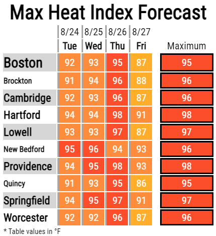 Good morning everyone, This is a quick update to correct the subject line of the briefing. Everything else remains unchanged. Thank you, Rodney Chai If you have any questions or would like more information, don't hesitate to contact us via this email address, on NWSChat <https://nwschat.weather.gov/>, or at the following: National Weather Service Boston/Norton, MA 46 Commerce Way Norton, MA 02766 508.622.3280 Website <http://www.weather.gov/boston> | Facebook <http://www.facebook.com/NWSBoston> | Twitter <http://www.twitter.com/NWSBoston> ---------- Previous message --------- From: BOX Operations - NOAA Service Account <box.operations@noaa.gov> Date: Tue, Aug 24, 2021 at 4:10 AM Subject: [08.24.2021 AM] Oppressive heat and humidity through Thursday To: Good morning everyone, Please find attached our latest briefing regarding the oppressive heat and humidity through Thursday. Thank you, Rodney Chai If you have any questions or would like more information, don't hesitate to contact us via this email address, on NWSChat <https://nwschat.weather.gov/>, or at the following: National Weather Service Boston/Norton, MA 46 Commerce Way Norton, MA 02766 508.622.3280 Website <http://www.weather.gov/boston> | Facebook <http://www.facebook.com/NWSBoston> | Twitter <http://www.twitter.com/NWSBoston>