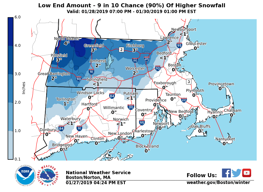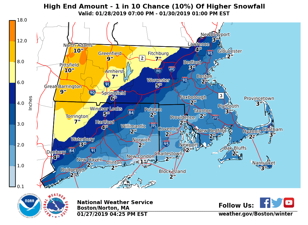 Good afternoon everyone, We continue to monitor a low pressure which will bring a period of snow, changing to rain for most, then back to snow late Tuesday into Wednesday. Due to uncertainty in how far inland the change to rain will penetrate, it is still difficult to determine snowfall amounts. We have included a first cut at the best and worst case scenarios, as well as an updated map of our current precipitation type expectations. Have higher confidence in a transition to rain across the eastern half of southern New England. Greater uncertainty with snowfall totals across the interior. We are still not certain how far inland the mixing line will get. *What:* - A storm system, moving along the northeast coast. - Potential for a period of snow, with a risk for total snowfall reaching Winter Storm criteria for some, especially across the western higher terrain. - Low risk for a period of ice and gusty winds. *Where:* - The highest risk for significant snowfall will be across northern and western portions of Massachusetts and Connecticut, with lower amounts toward the southeast coast. - Risk for icing and strongest winds highest across Rhode Island and Southeastern MA. *When:* - Beginning as mainly snow late Tuesday - Potential for a change to ice (with some snow continuing) early Wednesday morning. - Rain may change back to snow with additional accumulations possible Wednesday morning - Mostly done by Wednesday afternoon - Low risk for impact to Tuesday evening commute, higher risk for Wednesday morning commute. *When we will know more:* - We will begin to highlight details over the next 36 hours. Matthew Belk If you have any questions or would like more information, don't hesitate to contact us via this email address, on NWSChat <https://nwschat.weather.gov/>, or at the following: National Weather Service Boston/Norton, MA 46 Commerce Way Norton, MA 02766 508.622.3280 Website <http://www.weather.gov/boston> | Facebook <http://www.facebook.com/NWSBoston> | Twitter <http://www.twitter.com/NWSBoston>