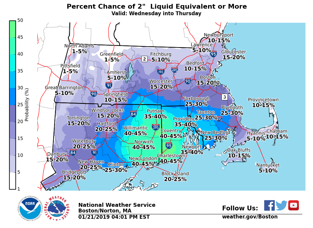 Good afternoon everyone, Ocean effect snow showers and dangerously cold wind chills will continue into tonight. Looking ahead, the potential exists for a heavy rainfall event Wednesday night into Thursday. Details are provided below. *What / Where / When ...* - Ocean Effect Snow - Mainly across the outer Cape from Provincetown to Chatham through tonight - Total accumulations of 1 to 2 inches with locally up to 3 inches in spots - Dangerously Cold Wind Chills all Southern New England - Wind chill advisories continue tonight with warnings for the Berkshires - Wind chills -10 to -20°F tonight into early Tuesday, -20 to -30°F for the Berkshires - Gales and Moderate to Heavy Freezing Spray - Gale Warnings on all waters tonight into Tuesday morning for gusts to 40+ knots - Moderate to locally heavy freezing spray into Tuesday morning - Freezing spray advisories and heavy freezing spray warnings continue - Heavy Rainfall and Possible Flooding - Greatest risk across eastern Connecticut, Rhode Island and southeast Massachusetts for late Wednesday night into Thursday - Rainfall of 1-2 inches across southern New England with locally up to 3 inches for RI and SE Massachusetts - Areas of urban and poor drainage flooding possible If you have any questions or would like more information, don't hesitate to contact us via this email address, on NWSChat <https://nwschat.weather.gov/>, or at the following: National Weather Service Boston/Norton, MA 46 Commerce Way Norton, MA 02766 508.622.3280 Website <http://www.weather.gov/boston> | Facebook <http://www.facebook.com/NWSBoston> | Twitter <http://www.twitter.com/NWSBoston>