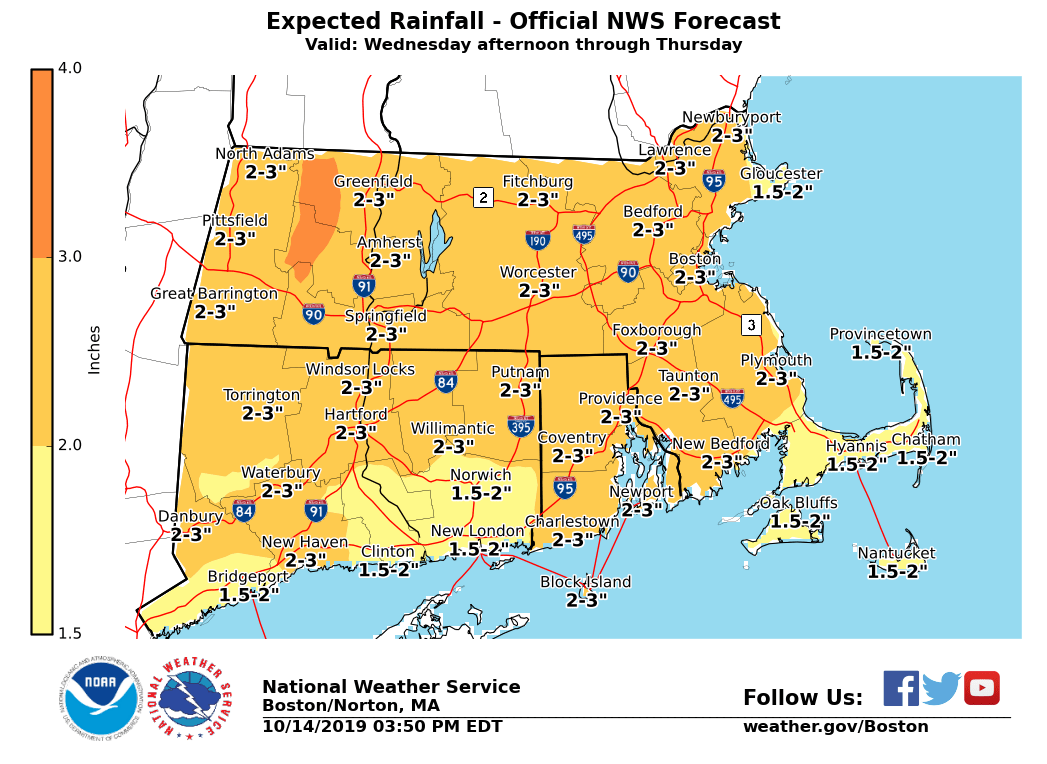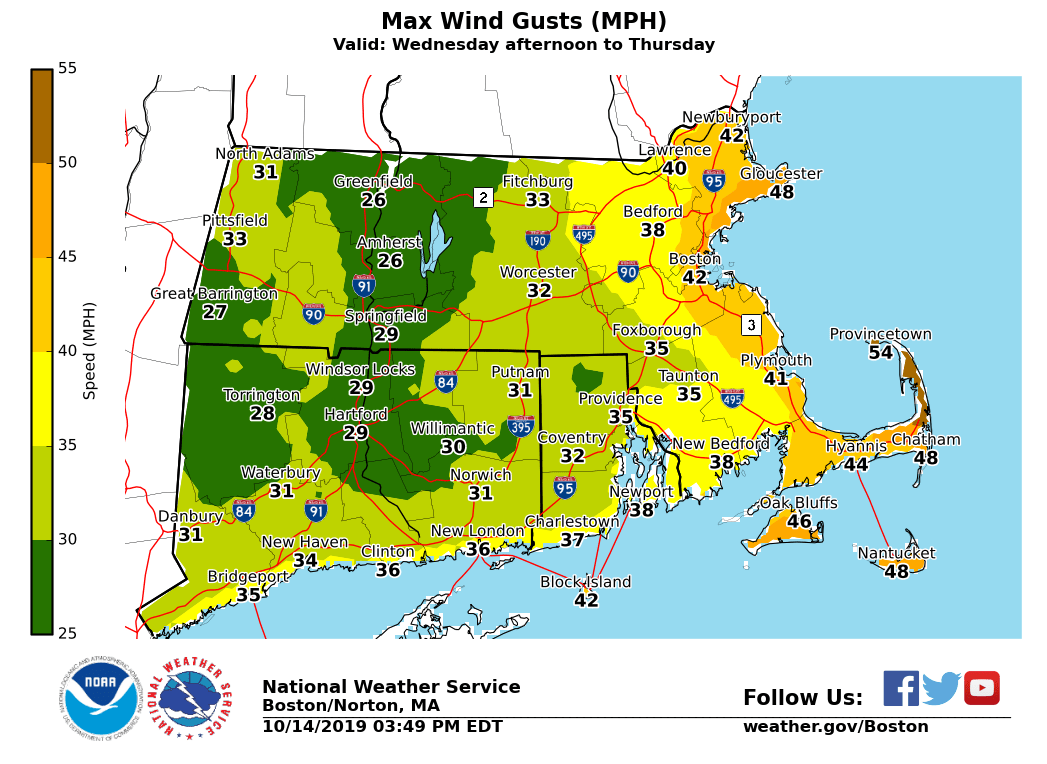 Good afternoon, A storm will develop off the Carolina Coast Wednesday and move across Southeast New England late Wednesday night/early Thursday. 1. Rain from the storm will develop during Wednesday afternoon and evening...from Noon to 3 PM in Northern CT and Western MA, and from 3 PM to 7 PM in RI and Central/Eastern MA. 2. Rain will be at its heaviest during Wednesday night. Rainfall amounts will range between 1.5 inches and 2.5 inches. 3. Strong winds will develop along the South Coast between 3 PM and 6 PM, and along the East Coast between 6 PM and Midnight. 4. Wind will be strongest between 2 AM and 8 AM, especially along the RI and Eastern Massachusetts coasts. Winds will gust to 35 to 45 mph in this area, with a few spots such as Outer Cape Cod possibly gusting to 55 mph. We have included a couple of graphics regarding the wind and rain. If you have any questions or would like more information, don't hesitate to contact us via this email address, on NWSChat <https://nwschat.weather.gov/>, or at the following: National Weather Service Boston/Norton, MA 46 Commerce Way Norton, MA 02766 508.622.3280 Website <http://www.weather.gov/boston> | Facebook <http://www.facebook.com/NWSBoston> | Twitter <http://www.twitter.com/NWSBoston>