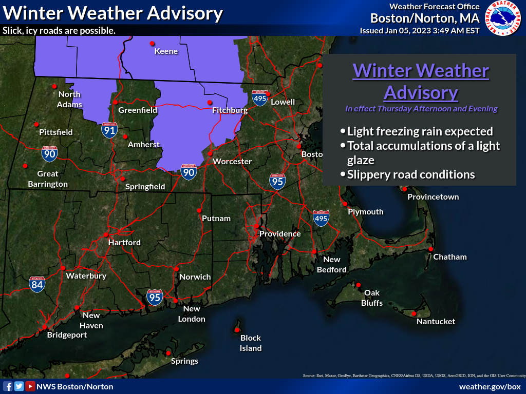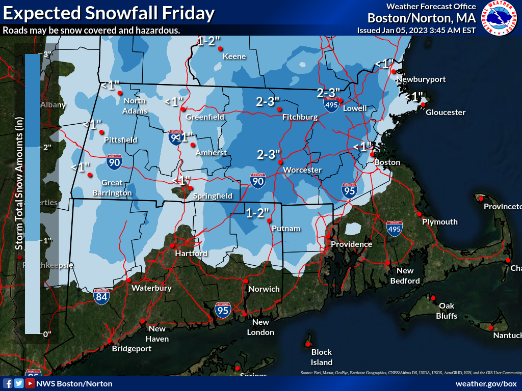 Good morning everyone, As we approach the end of the week we are shifting focus from the limited area of freezing rain possible this afternoon and evening above 1,000 ft to an expected accumulating snowfall on Friday. See the attached briefing for more details. Thank you, Bryce Williams and Hayden Frank If you have any questions or would like more information, don't hesitate to contact us via this email address, on NWSChat <https://nwschat.weather.gov/>, or at the following: National Weather Service Boston/Norton, MA 46 Commerce Way Norton, MA 02766 508.622.3280 Website <http://www.weather.gov/boston> | Facebook <http://www.facebook.com/NWSBoston> | Twitter <http://www.twitter.com/NWSBoston>