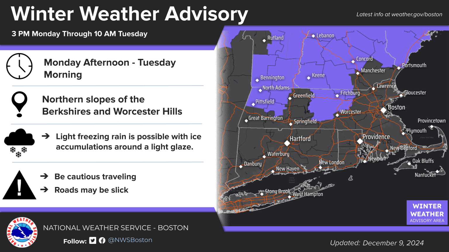 Good afternoon everyone, There are no changes to the forecast regarding the potential for light icing across the higher elevations of the northern Berkshires and Worcester Hills. There may be pockets of light freezing rain and/or freezing drizzle this evening through Tuesday morning. A Winter Weather Advisory continues into Tuesday morning. In addition, an impactful storm will bring heavy rain and strong coastal winds to southern New England Wednesday into Wednesday night. The heavy rain may result in localized urban and poor drainage street flooding and strong winds may cause some power outages near the coast. A High Wind Watch is in effect for much of coastal southern New England. Please see the attached one pager and supporting graphics for more details. Thanks. Kevin Cadima and Rob Megnia If you have any questions or would like more information, please don't hesitate to contact us. You can reach us via: email: box.operations@noaa.gov phone: 508.622.3280 Slack/NWSChat 2.0 <https://nwschatws.slack.com/> (for approved partners) social media: Website <http://www.weather.gov/boston> | Facebook <http://www.facebook.com/NWSBoston> | Twitter <http://www.twitter.com/NWSBoston>