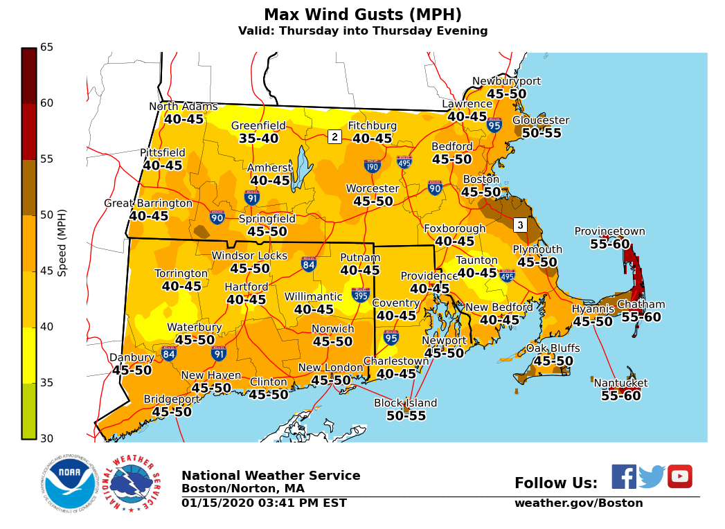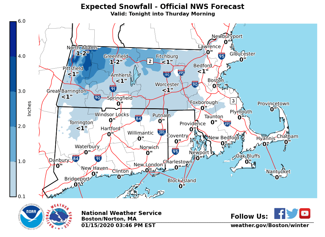 Good afternoon everyone, We have a few weather concerns for the next few days which will be highlighted below. *Minor snow accumulations late tonight:* *What/Where:* 1-2 inches interior northern MA with up to 3 inches in the northern Berkshires *Timing:* A period of snow developing after midnight and ending Thursday morning. *Impacts:* Untreated roads may be slippery during the morning commute. *Strong winds Thursday:* *What:* Northwest gusts 40 to 55 mph. A Wind Advisory is in effect. *Where:* All of southern New England *When:* Thursday into Thursday evening *Impacts:* Some tree damage with isolated power outages. *Potential for accumulating snow Saturday afternoon/night:* *What/Where/When:* - Plowable snow accumulations possible away from immediate south coast - Several inches possible across interior northern and NW MA where max snowfall expected - Snow developing Saturday afternoon from west to east, likely changing to rain along the coast in the evening with rain-snow line advancing north across the region during the night. - Precipitation ending late Saturday night *Uncertainty:* - Timing of changeover and how far north rain-snow line gets is uncertain and this will impact specific snowfall accumulations - Moderate to high confidence in a period of accumulating snow but specific amounts uncertain Please let us know if you have any questions or concerns! Thank You Meteorologist: Kevin Cadima If you have any questions or would like more information, don't hesitate to contact us via this email address, on NWSChat <https://nwschat.weather.gov/>, or at the following: National Weather Service Boston/Norton, MA 46 Commerce Way Norton, MA 02766 508.622.3280 Website <http://www.weather.gov/boston> | Facebook <http://www.facebook.com/NWSBoston> | Twitter <http://www.twitter.com/NWSBoston>