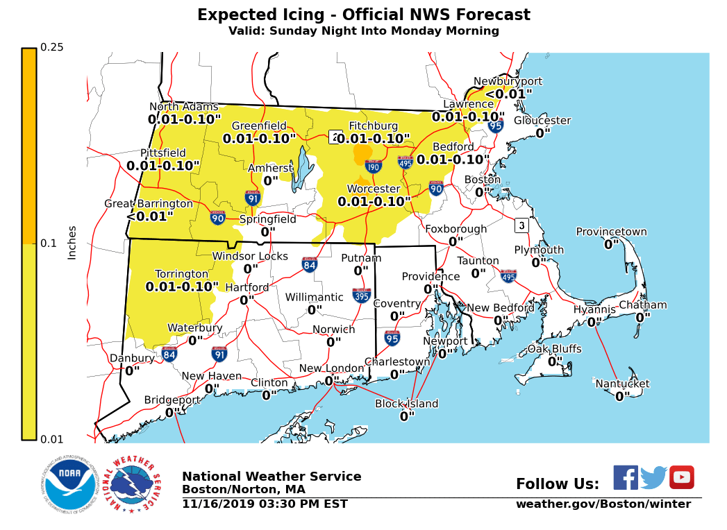 Good afternoon everyone, Little has changed from the previous briefing sent earlier this morning. A coastal storm passing southeast of Nantucket Monday will bring the potential for light icing across parts of the interior, strong winds near the coast, and minor coastal flooding to eastern Massachusetts. Refer to the attached graphics. Here are the details: *Interior Light Icing:* *Locations*: Western and central Massachusetts and part of northern Connecticut, especially in the higher elevations from the east slopes of the Berkshires, Worcester Hills, and hills of Hartford and Tolland Counties. *Timing:* 10 PM Sunday through 10 AM Monday *Amounts*: Up to 1/10 inch of icing *Impact*: Slippery travel *Confidence:* High in light icing across Worcester Hills and east slopes of Berks. Light icing is also possible in the Pioneer and Merrimack Valleys in Massachusetts but temperatures may stay just above freezing in these locations. *Strong Winds:* *Locations*: The Immediate coastline especially Cape Cod and Nantucket. *Timing:* 10 PM Sunday through 10 AM Monday *Sustained Wind:* NE 25 to 35 mph *Wind Gusts:* NE 35 to 45 mph with a few gusts up to 50 mph possible. *Impact*: Minor damage such as downed tree limbs. Perhaps Isolated power outages. *Confidence:* High *Marine Impacts:* *Locations*: Massachusetts and Rhode Island coastal waters *Timing:* 5 PM Sunday through 10 AM Monday on the south coastal waters; 11 PM Sunday to 4 PM Monday on the eastern waters *Wind Gusts:* NE 35 to 45 kt *Seas:* 4 to 9 ft on the inner bays and sounds; 14 to 18 ft offshore *Confidence:* High *Minor Coastal Flooding:* *Locations*: Eastern Massachusetts coast *Timing:* Monday afternoon high tide (3:10 PM at Boston and 4:17 PM on Nantucket) *Storm Surge:* 1.5 to 2.0 feet *Inundation:* Less than 1 foot above ground level *Impact*: Some vulnerable shoreline roads may become temporarily impassable around high tide. Minor beach erosion is also possible. *Confidence:* High. It is unlikely that the storm surge exceeds 2.0 feet so any impacts are expected to be minor. The next update will be sent early Sunday morning. If you have any questions or would like more information, don't hesitate to contact us via this email address, on NWSChat <https://nwschat.weather.gov/>, or at the following: Thank You Meteorologist: Hayden Frank National Weather Service Boston/Norton, MA 46 Commerce Way Norton, MA 02766 508.622.3280 Website <http://www.weather.gov/boston> | Facebook <http://www.facebook.com/NWSBoston> | Twitter <http://www.twitter.com/NWSBoston>