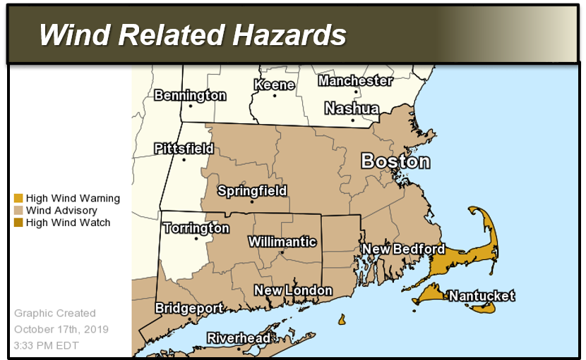 Good afternoon everyone, Winds will continue to be gusty enough to have some impact on power restoration efforts, and potentially lead to some additional wind damage and scattered power outages late this afternoon into the evening. Later this evening into the overnight hours winds will diminish. - A *High Wind Warning* remains in effect *until 6 PM* for Cape Cod and the Islands - Winds 30-40 mph & gusts 50-60 mph possible. - A *Wind Advisor*y continues *until 6 PM* for the remainder of southern New England - Winds 20-30 mph & gusts 40-50 mph possible. Meteorologist Bryce Williams If you have any questions or would like more information, don't hesitate to contact us via this email address, on NWSChat <https://nwschat.weather.gov/>, or at the following: National Weather Service Boston/Norton, MA 46 Commerce Way Norton, MA 02766 508.622.3280 Website <http://www.weather.gov/boston> | Facebook <http://www.facebook.com/NWSBoston> | Twitter <http://www.twitter.com/NWSBoston>