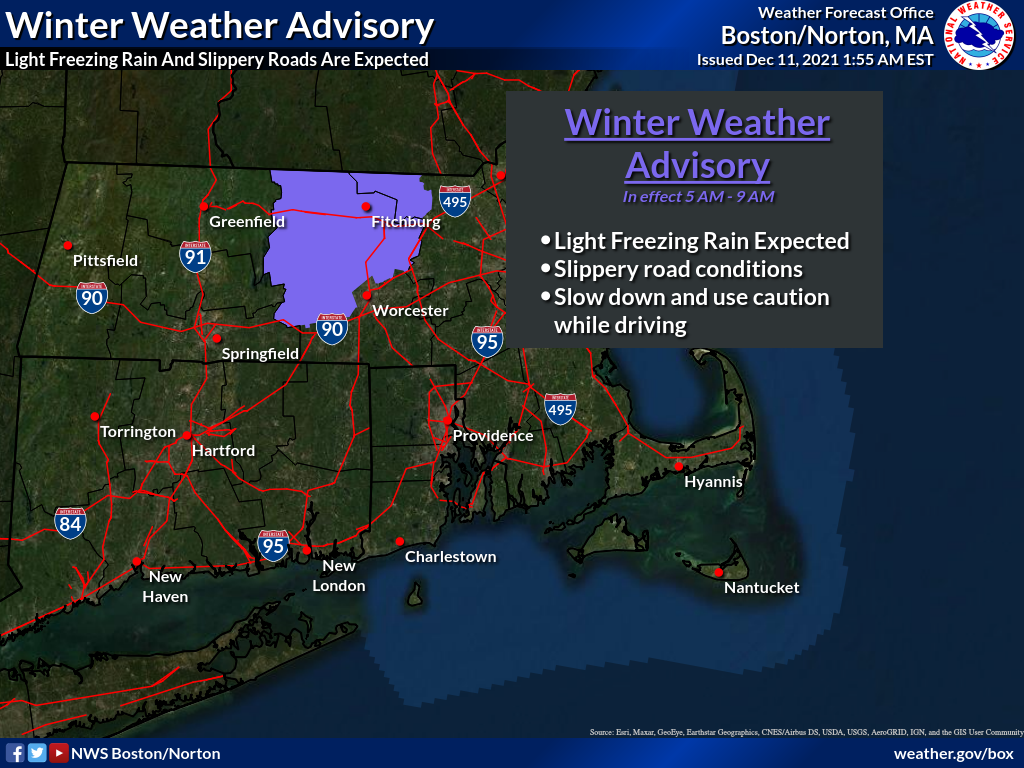 There will be a chance for freezing rain this morning across the northern portions of Worcester and Middlesex counties. This has prompted a winter weather advisory in effect from 5am to 9am for these areas. Impacts will be limited to slippery roads resulting in hazardous travel conditions. A graphic highlighting the area covered by the advisory is attached.