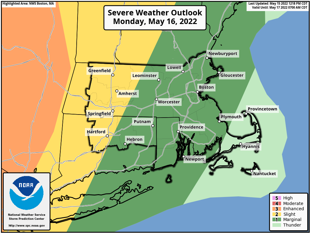 Good Afternoon, Attached is a briefing regarding the potential for strong to severe storms Monday afternoon and evening; generally between 5 and 9 pm. The greatest threats associated with these possible storms will be strong wind gusts and localized poor drainage and street flooding, primarily across the CT River Valley in western MA and central CT. The Storm Prediction Center has placed these areas in a SLIGHT risk for severe weather. Storms are anticipated to weaken as they move east. The risk for severe weather east of the CT river valley decreases significantly as any storms that do form will likely weaken after sunset. Kind regards, Kristie Smith, Hayden Frank, and Rob Megnia If you have any questions or would like more information, don't hesitate to contact us via this email address, on NWSChat <https://nwschat.weather.gov/>, or at the following: National Weather Service Boston/Norton, MA 46 Commerce Way Norton, MA 02766 508.622.3280 Website <http://www.weather.gov/boston> | Facebook <http://www.facebook.com/NWSBoston> | Twitter <http://www.twitter.com/NWSBoston>