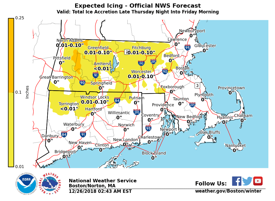 Good morning everyone, This email aims to give you a heads-up on the potential for a period of sleet and freezing rain on the front end of our next wet weather system across portions of interior southern New England, particularly the higher terrain of Massachusetts including the Berkshires and Worcester Hills. This system arrives in the early hours of Friday morning and may impact the Friday morning commute before it transitions to an all rain event. *What:* - A mix of freezing rain and sleet, changing to rain. - Light ice accumulations possible, with slippery conditions on area roadways. - Risk for some impact to Friday morning commute. *Where:* - Especially the higher terrain of western and central Massachusetts and Connecticut *When:* - Precipitation begins early Friday morning. - Gradual change to rain through early-mid morning. *When We Will Know More:* We will continue to resolve the precipitation type issues over the next 24 hours. Some Winter Weather Advisories are possible where ice is expected. If you have any questions or would like more information, don't hesitate to contact us via this email address, on NWSChat <https://nwschat.weather.gov/>, or at the following: National Weather Service Boston/Norton, MA 46 Commerce Way Norton, MA 02766 508.622.3280 Website <http://www.weather.gov/boston> | Facebook <http://www.facebook.com/NWSBoston> | Twitter <http://www.twitter.com/NWSBoston>