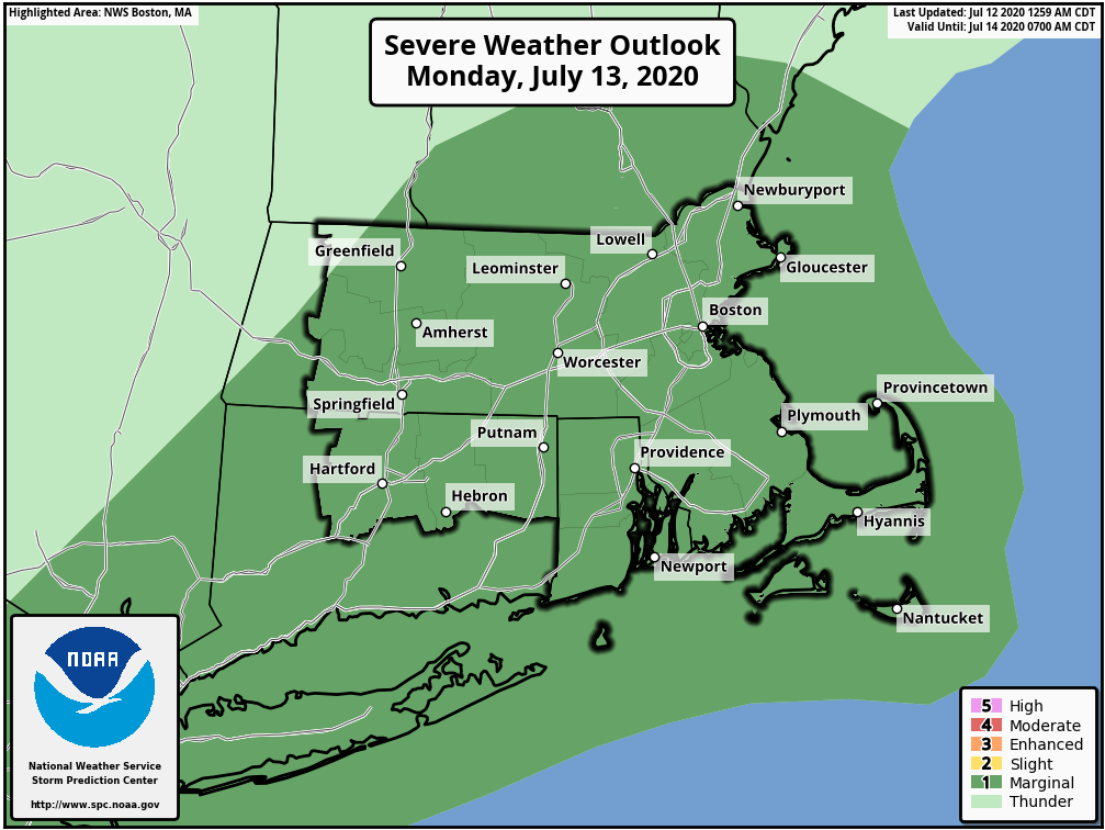 Good morning everyone, We wanted to let you know about a chance for some strong to severe thunderstorms impacting portions of southern New England Monday afternoon and evening. This doesn't look like a widespread severe event but some severe storms are possible. *Threats:* Localized damaging winds and flash flooding *Timing: * Noon to 8pm *Location: * All of southern New England except for Cape Cod and the Islands If you have any questions or would like more information, don't hesitate to contact us via this email address, on NWSChat <https://nwschat.weather.gov/>, or by phone at 508.622.3280. Thanks, Bryce Williams and Hayden Frank National Weather Service Boston/Norton, MA 46 Commerce Way Norton, MA 02766 508.622.3280 Website <http://www.weather.gov/boston> | Facebook <http://www.facebook.com/NWSBoston> | Twitter <http://www.twitter.com/NWSBoston>
