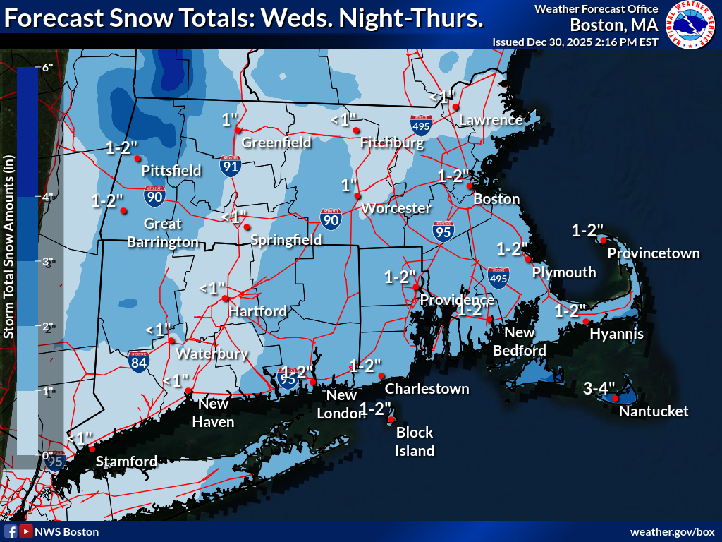 Good afternoon, we’ve issued a Winter Weather Advisory for Nantucket and Martha’s Vineyard, in effect Wednesday evening through early Thursday morning. This is not expected to be a major winter storm, but 2–4 inches of snow is likely on the islands. Periods of steadier snow are possible overnight, with the greatest concern between 1 AM and 6 AM, when brief heavier bursts could reduce visibility and quickly create slick road conditions. The timing is less than ideal, as this may coincide with New Year’s celebrations wrapping up, increasing the risk for hazardous travel late tomorrow tonight and early Thursday. We've attached a snowfall map highlighting the expected snowfall amounts. Please let us know if you have any questions or need additional support as the event unfolds. Meteorologists: Torry Dooley, Kevin Cadima, Candice Hrencecin, and Caitlyn Mensch If you have any questions or would like more information, please don't hesitate to contact us. You can reach us via: email: box.operations@noaa.gov phone: 508.622.3280 Slack/NWSChat 2.0 <https://nwschatws.slack.com/> (for approved partners) social media: Website <http://www.weather.gov/boston> | Facebook <http://www.facebook.com/NWSBoston> | Twitter <http://www.twitter.com/NWSBoston>