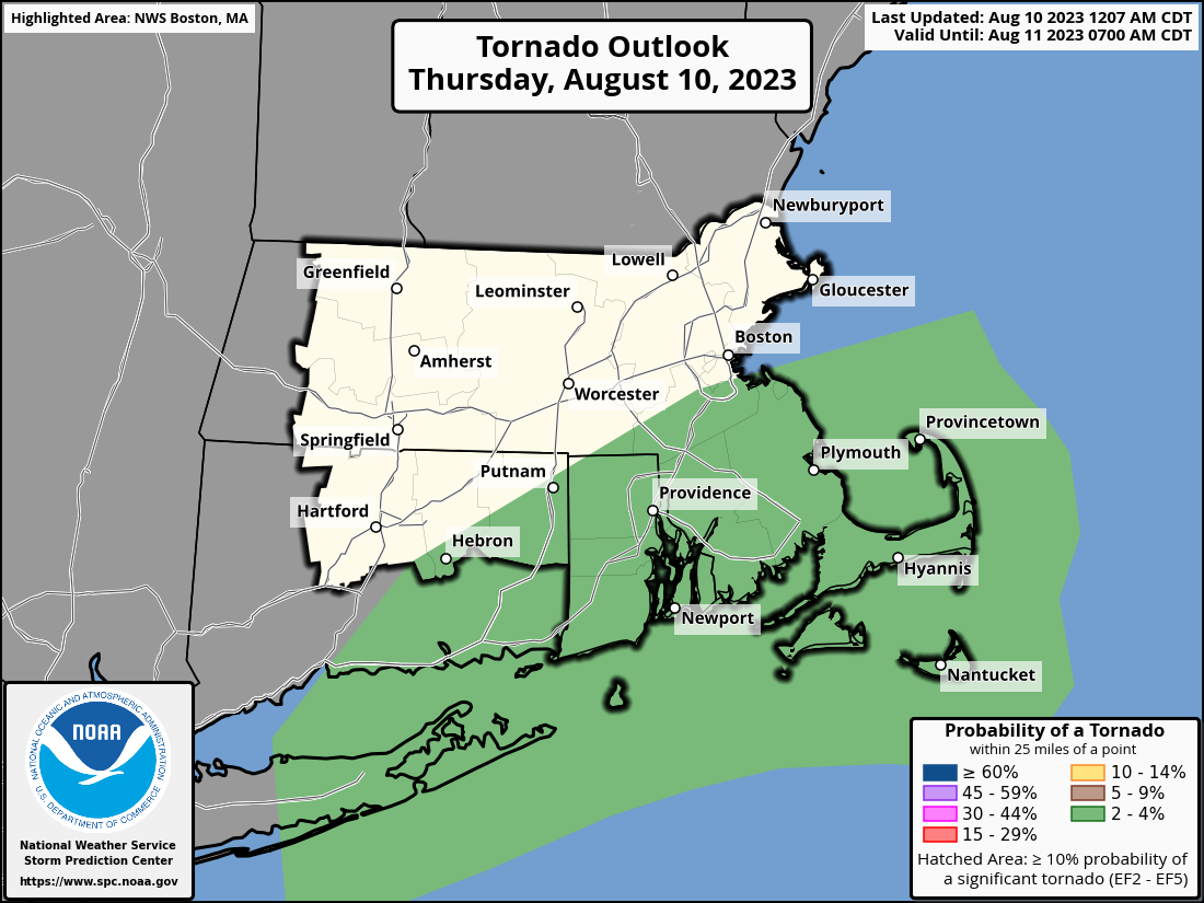 Good morning, There have been no significant changes to the forecast for tonight into Friday. Please find some key messages below. - There remains the potential for heavy rainfall, strong thunderstorms, and an isolated tornado this evening into early Friday. - The greatest risk for heavy rainfall remains across eastern MA and RI. Flood Watch remains in effect through early Friday. - The greatest risk for an isolated tornado will be over The Cape and Islands. One small change to note is that The Storm Prediction Center has expanded the 2% tornado probability a bit further west into CT (see attached graphic). We'll likely provide one final briefing this afternoon before the event to notify you of any potential changes to the forecast. Thank you and have a great day, Rob Megnia and Glenn Field If you have any questions or would like more information, please don't hesitate to contact us. You can reach us via: email: box.operations@noaa.gov phone: 508.622.3280 Slack/NWSChat 2.0 <https://nwschatws.slack.com/> (for approved partners) social media: Website <http://www.weather.gov/boston> | Facebook <http://www.facebook.com/NWSBoston> | Twitter <http://www.twitter.com/NWSBoston>