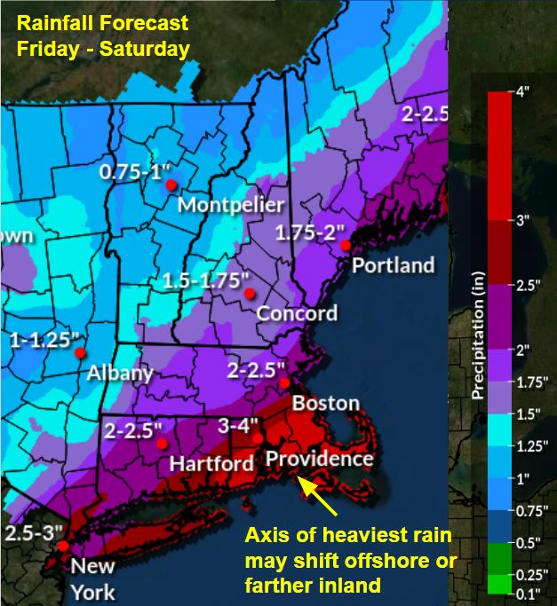 Good Afternoon Everyone, Given the recent attention on Subtropical Storm Nicole, currently well off the east coast of Florida, we wanted to provide an early heads up on potential impacts to southern New England later this week. See the attached one-page briefing and preliminary rainfall forecast for details. Here are the Key Points: 1. Nicole, or more likely its remnants, may move quickly through southern New England sometime in the Friday to Saturday time frame. It may bring heavy rain and gusty winds. 2. Potential impacts include flooding of urban areas and smaller rivers and streams. Minor wind damage, such as downed branches, is also possible. 3. Marine impacts are possible with this system as well. Gale force winds and rough seas may lead to hazardous conditions for vessels, especially on the offshore waters. Keep in mind there will likely be changes in the forecast over the next few days, especially with respect to the location and amounts of the heaviest rainfall. We will provide an updated email briefing Tuesday afternoon. In the meantime, if you have any questions or would like more information, don't hesitate to contact us by phone, via this email address, or on NWSChat <https://nwschat.weather.gov/>. Thanks, Joe Dellicarpini and Hayden Frank National Weather Service Boston/Norton, MA 46 Commerce Way Norton, MA 02766 508.622.3280 Website <http://www.weather.gov/boston> | Facebook <http://www.facebook.com/NWSBoston> | Twitter <http://www.twitter.com/NWSBoston>