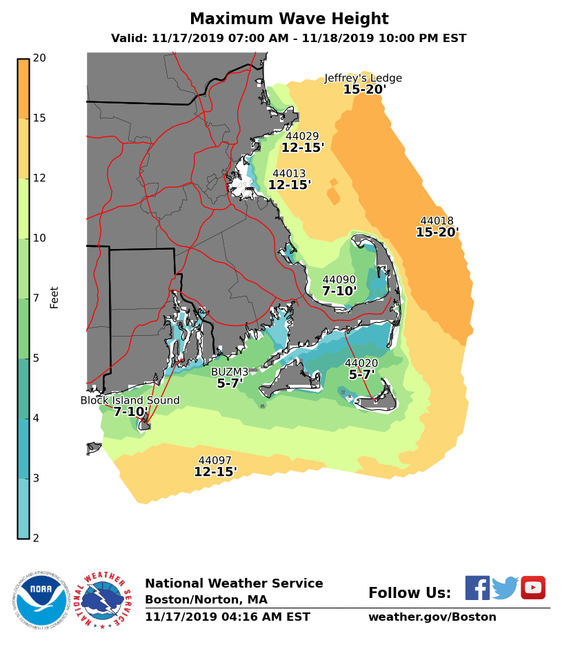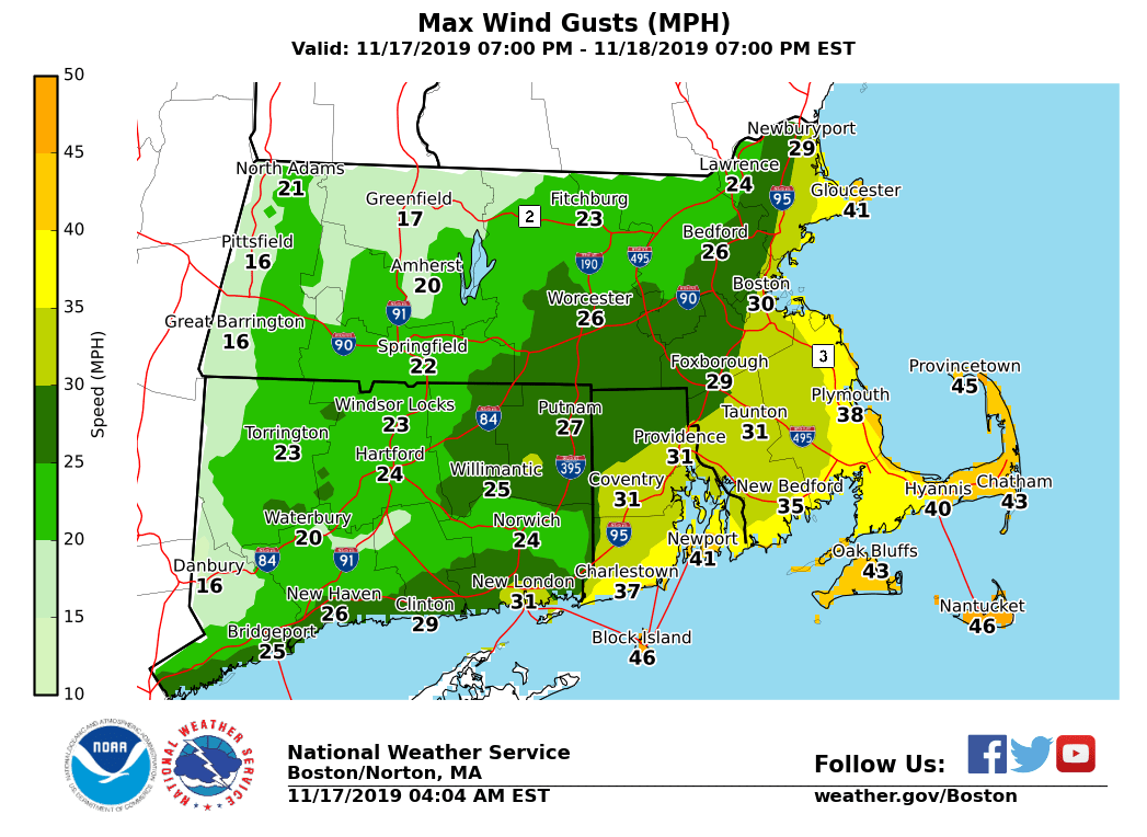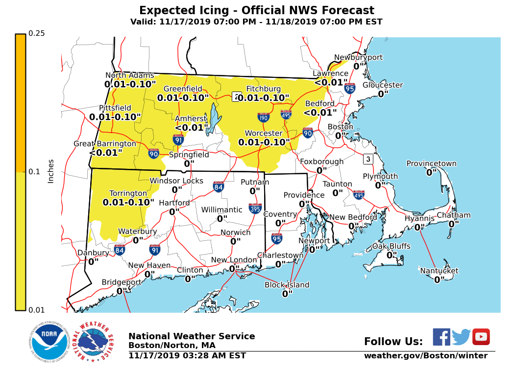Good morning everyone, Little significant changes to forecast expectations regarding a coastal storm which looks to pass southeast of Nantucket Monday. This coastal storm will bring the potential for light icing across parts of the interior, strong winds near the coast, and minor coastal flooding to eastern Massachusetts on Monday. *Changes from yesterday afternoon's briefing: * - *Winter Weather Advisory Issued[*Midnight Thru Noon Monday]: Franklin, Hampshire, Worcester and Middlesex Counties in MA due to light ice accretions. *Note:* Expansion of the Winter Weather Advisory *may* be needed in later updates into Hampshire, Hartford, Tolland Counties in western MA and northern CT, and into western Essex County in eastern MA. - *Wind Advisory Issued*[1 AM Thru 5 PM Monday]: Dukes and Nantucket Counties in MA and Block Island in RI for strong northeast winds. *Note:* Expansion of the Wind Advisory *may* be needed in later updates for Cape Cod. - *Coastal Flood Advisory Issued*[2 PM to 5 PM Monday]: Eastern MA coast, Barnstable and Nantucket Counties for minor coastal flooding at/around the Monday afternoon high tide. Details below: *Interior Light Icing:* *Locations*: Western and central Massachusetts and part of northern Connecticut, especially in the higher elevations from the east slopes of the Berkshires, Worcester Hills, and hills of Hartford and Tolland Counties. *Timing:* Midnight through 10 AM Monday *Amounts*: Up to 1/10 inch of icing *Impact*: Slippery travel, impacting Monday AM commute. *Confidence:* Highest confidence in the Winter Weather Advisory area of light ice accretions. A brief period of freezing rain is possible in western Essex County MA and into Hartford & Tolland Counties, but lowered confidence in these areas due to potential for temperatures remaining just above freezing. *Strong Winds:* *Locations*: Mainly Dukes and Nantucket Counties into Block Island, and Cape Cod. *Timing:* 1 AM through 10 AM Monday. *Sustained Wind:* NE 25 to 35 mph. *Wind Gusts:* NE 35 to 45 mph with a few gusts up to 50 mph possible. Gusts to 40 mph across Cape Cod. *Impact*: Minor damage such as downed tree limbs. Perhaps Isolated power outages. *Confidence:* High across the Islands, lesser/moderate confidence for Cape Cod. Greatest potential for wind gusts capable of minor impacts toward the Islands, but may be possible for Cape Cod. *Marine Impacts:* *Locations*: Massachusetts and Rhode Island coastal waters *Timing:* 5 PM Sunday through 10 AM Monday on the south coastal waters; 11 PM Sunday to 4 PM Monday on the eastern waters *Wind Gusts:* NE 35 to 45 kt. *Seas:* 4 to 9 ft on the inner bays and sounds; 14 to 17 ft offshore. *Confidence:* High. *Minor Coastal Flooding:* *Locations*: Eastern Massachusetts coast *Timing:* Monday afternoon high tide (3:10 PM at Boston and 4:17 PM on Nantucket) *Storm Surge:* 1.5 to 2.0 feet *Inundation:* Less than 1 foot above ground level *Impact*: Some vulnerable shoreline roads may become temporarily impassable around high tide. Minor beach erosion is also possible. *Confidence:* High. It remains unlikely that the storm surge exceeds 2.0 feet so any impacts are expected to be minor. Updated storm total ice, maximum wind gust and maximum wave height graphics are attached, as well as an overview of issued hazards. Next update will be sent Sunday afternoon. Meteorologists: Andrew Loconto and Kevin Cadima If you have any questions or would like more information, don't hesitate to contact us via this email address, on NWSChat <https://nwschat.weather.gov/>, or at the following: National Weather Service Boston/Norton, MA 46 Commerce Way Norton, MA 02766 508.622.3280 Website <http://www.weather.gov/boston> | Facebook <http://www.facebook.com/NWSBoston> | Twitter <http://www.twitter.com/NWSBoston>
