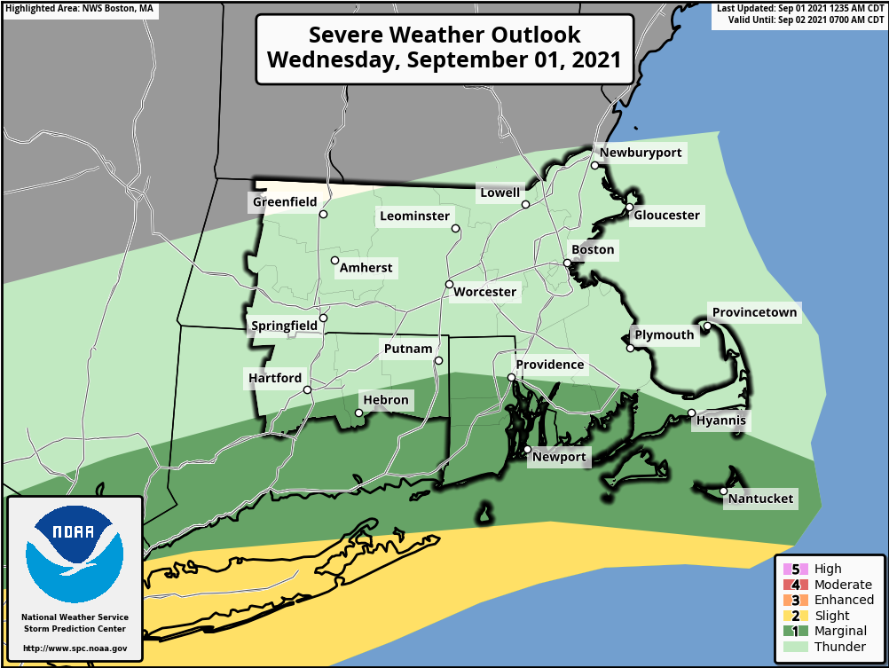 Good morning everyone, Attached is our latest one-page briefing and supporting graphics regarding the potential for heavy rainfall and significant flooding tonight and into Thursday. This may cause impacts such as road closures and washouts, as well as impact Thursday morning commuters. No major changes since the last briefing. Flash flood watch remains in effect. Highest rainfall amounts are still forecast for areas south of I-90. Isolated rainfall amounts up to 7" are not out of the question. Heavy rainfall and potential for flooding continues to be* the greatest risk *in this event. A possibility remains for strong thunderstorms late tonight into Thursday. These may carry with them a low probability of brief tornadoes or thunderstorm-related wind damage. The best chance for experiencing strong thunderstorms is along south coastal Southern New England and Cape Cod, highlighted in the area in forest green on the attached Thunderstorm Outlook graphic from the Storm Prediction Center. Outside of the thunderstorm threat, there is also the potential for 30-40 mph wind gusts across eastern MA very early Thursday morning. With saturated grounds and fully leaved trees, downed trees and power outages will be possible. Thank You, Meteorologists: Rob Megnia and Hayden Frank If you have any questions or would like more information, don't hesitate to contact us via this email address, on NWSChat <https://nwschat.weather.gov/>, or at the following: National Weather Service Boston/Norton, MA 46 Commerce Way Norton, MA 02766 508.622.3280 Website <http://www.weather.gov/boston> | Facebook <http://www.facebook.com/NWSBoston> | Twitter <http://www.twitter.com/NWSBoston>