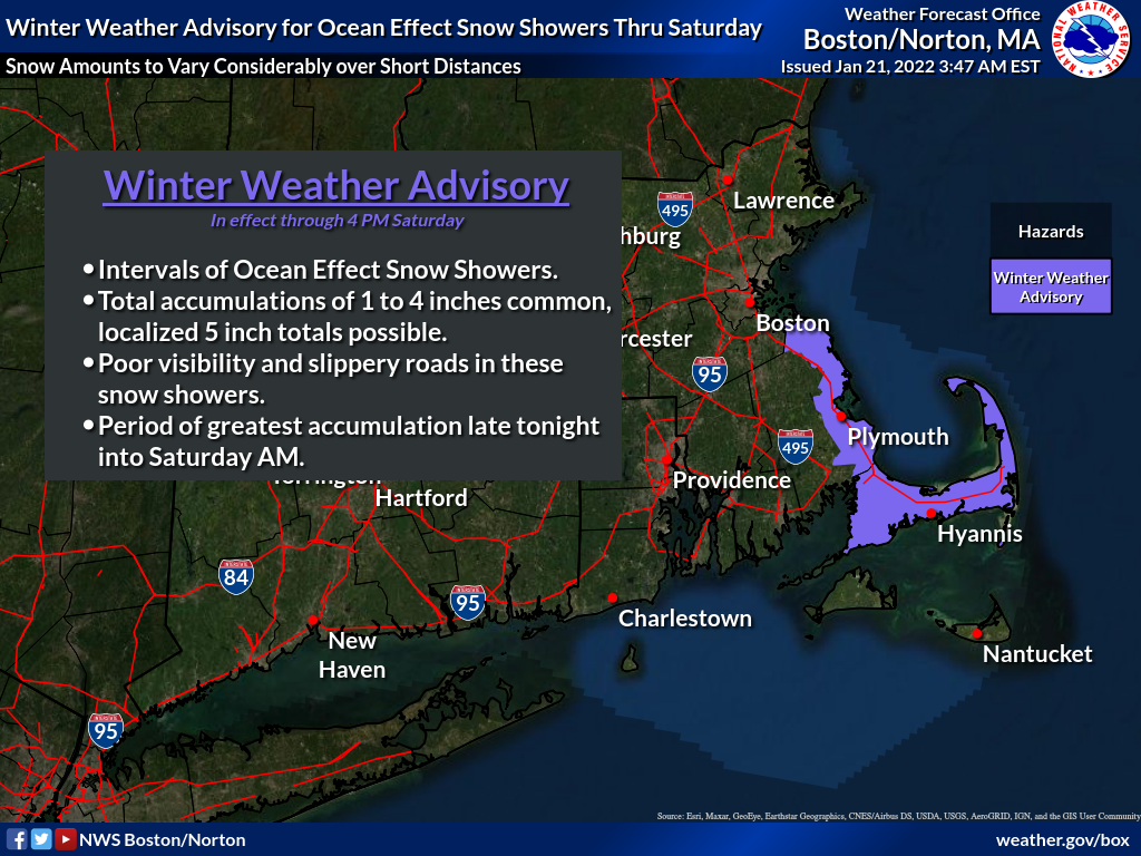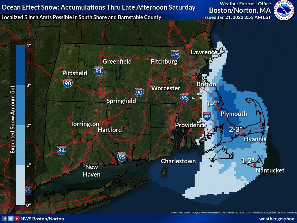[2022.01.21 AM] NWS Boston EM Briefing: Accumulating Ocean Effect Snow Showers for South Shore and Cape Cod Thru Saturday Afternoon