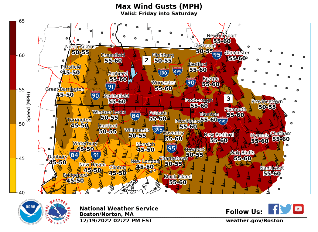 Good Afternoon Everyone, We are monitoring the potential for an impactful storm that could affect holiday travel Friday into Saturday. Please see the attached one-page briefing for details. Concerns include: - Damaging winds up to 60 MPH Friday from the south or southeast, and strong west/southwest winds up to 45 MPH on Saturday which could affect power restoration efforts. - Moderate coastal flooding along parts of both the east and south coasts during the Friday morning high tide. Moderate flooding refers to flooding 1 to 3 feet deep in more vulnerable locations which could require road closures. - Minor river flooding, especially along the mainstem Connecticut River. Minor flooding refers to flooding less than one foot deep, and is primarily confined to low lying areas. - Hazardous winds and seas for marine travel. Additionally, much colder air is expected to follow Saturday and Christmas Day with wind chills in the single numbers and teens. We will provide our next update Tuesday afternoon. In the meantime, if you have any questions, don't hesitate to contact us via this email address, on NWSChat <https://nwschat.weather.gov/>, or by phone at (508) 622-3280. Thanks, Joe Dellicarpini and Hayden Frank NWS Boston/Norton