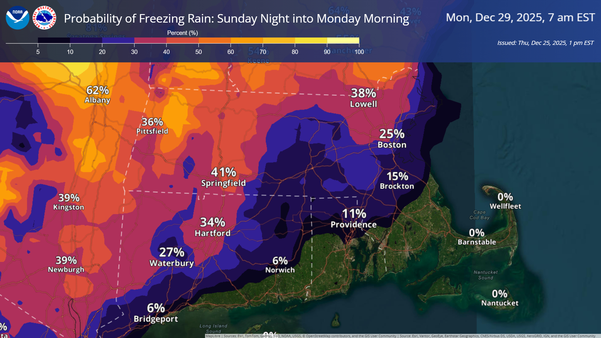 Good afternoon, A clipper system is expected to bring accumulating snowfall across western Massachusetts as well as central and western Connecticut from Friday night through Saturday morning. Eastern portions of southern New England will also see snow, though amounts are expected to be lower. *Current confidence* Forecast confidence is *moderate*. The primary challenge remains a narrow snowfall gradient, where subtle shifts in the system track will result in notable differences in snowfall totals. *What’s changed since this morning* A Winter Weather Advisory has been issued for Hartford County (CT) and western Hampshire County (MA). Neighboring forecast offices have issued similar headlines. Please see the attached image for additional details. *Timing* - Snow moves west to east Friday evening, generally between 8 PM and midnight. - Along the eastern Massachusetts coast, light snow may begin between midnight and 2 AM. - Snow tapers off early Saturday morning, ending as light snow showers between 6 AM and 9 AM. *Accumulations* - *Greatest confidence in impactful snowfall:* Central and western Connecticut and western Massachusetts - Snowfall amounts: 2–4", with localized totals up to 5" - *Lower snowfall amounts:* Rhode Island and central/eastern Massachusetts - Snowfall amounts: a coating up to 2" *Post-event* Drier conditions are expected late Saturday into Sunday. Another system may bring a threat of freezing rain late Sunday evening into early Monday morning. An attached image highlights areas with the greatest potential for freezing rain, mainly across interior southern New England. While details remain limited, we wanted to raise awareness as the busy holiday weekend concludes. Additional information will be provided as confidence increases. Our next briefing is expected by *6 AM Friday morning*. Thank you, *Meteorologists:* Candice Hrencecin Matthew Belk Emily McMinn Torry Dooley If you have any questions or would like more information, please don't hesitate to contact us. You can reach us via: email: box.operations@noaa.gov phone: 508.622.3280 Slack/NWSChat 2.0 <https://nwschatws.slack.com/> (for approved partners) social media: Website <http://www.weather.gov/boston> | Facebook <http://www.facebook.com/NWSBoston> | Twitter <http://www.twitter.com/NWSBoston>