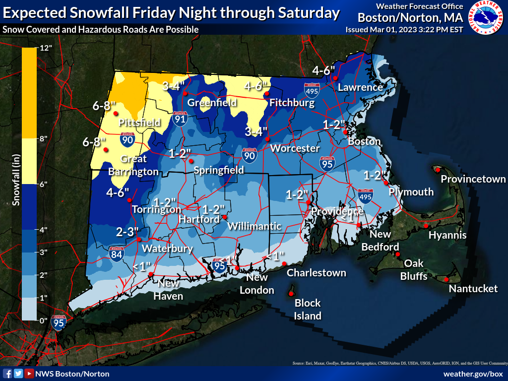 Good afternoon, Please find our latest update regarding the accumulating snow potential late Friday night-Saturday morning attached below. We would like to emphasize that precipitation is not expected to begin until AFTER the Friday Evening commute. Additionally, confidence in accumulating snow is highest north of the I-90 corridor, with the greatest risk for accumulations in excess of 6" most likely above 600ft in elevation north of the Rte 2 Corridor. Travel impacts are expected to be limited south of the MA Turnpike, as temperatures will remain near or above freezing overnight. Minor shifts in the exact track of the system will result in changes to the potential for accumulating snowfall. We also anticipate that winds in excess of 40 mph will affect the eastern MA coastline, with winds gusting over 50 mph possible, especially across the Cape and Islands. A gale watch is currently in place for the waters. Mariners should be aware that storm warnings may need to be considered for a large portion of Saturday. While we do not currently have winter weather headlines in place for this system, it is likely that they will be considered over the next 24 hours. Please do not hesitate to reach out with any questions. Kristie Smith, Bill Leatham, and Hayden Frank If you have any questions or would like more information, don't hesitate to contact us via this email address, on NWSChat <https://nwschat.weather.gov/>, or at the following: National Weather Service Boston/Norton, MA 46 Commerce Way Norton, MA 02766 508.622.3280 Website <http://www.weather.gov/boston> | Facebook <http://www.facebook.com/NWSBoston> | Twitter <http://www.twitter.com/NWSBoston>