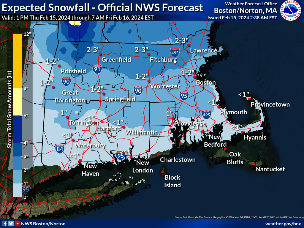 Good morning, We are writing to inform you that a *Wind Advisory* has been issued for much of central and western Massachusetts, including Cape Cod and the Islands (Nantucket, Martha's Vineyard, and Block Island). This advisory is effective from late Thursday night through early Friday afternoon. Please be aware that if confidence in the forecast continues to increase, the advisory area could expand during the next forecast issuance. The primary concern is strong westerly gusts 50 to 55 mph. In addition, overnight, a minor clipper system is expected to bring a quick hit of snow. Accumulations ranging from a light dusting to 3 inches are possible, with certain areas in the Berkshires potentially seeing localized amounts reaching 4 inches.For further details, please refer to the attached image. The next briefing is expected to be issued no later than 6 p.m. this afternoon. Thank you, Torry Dooley & Kevin Cadima If you have any questions or would like more information, please don't hesitate to contact us. You can reach us via: email: box.operations@noaa.gov phone: 508.622.3280 Slack/NWSChat 2.0 <https://nwschatws.slack.com/> (for approved partners) social media: Website <http://www.weather.gov/boston> | Facebook <http://www.facebook.com/NWSBoston> | Twitter <http://www.twitter.com/NWSBoston>