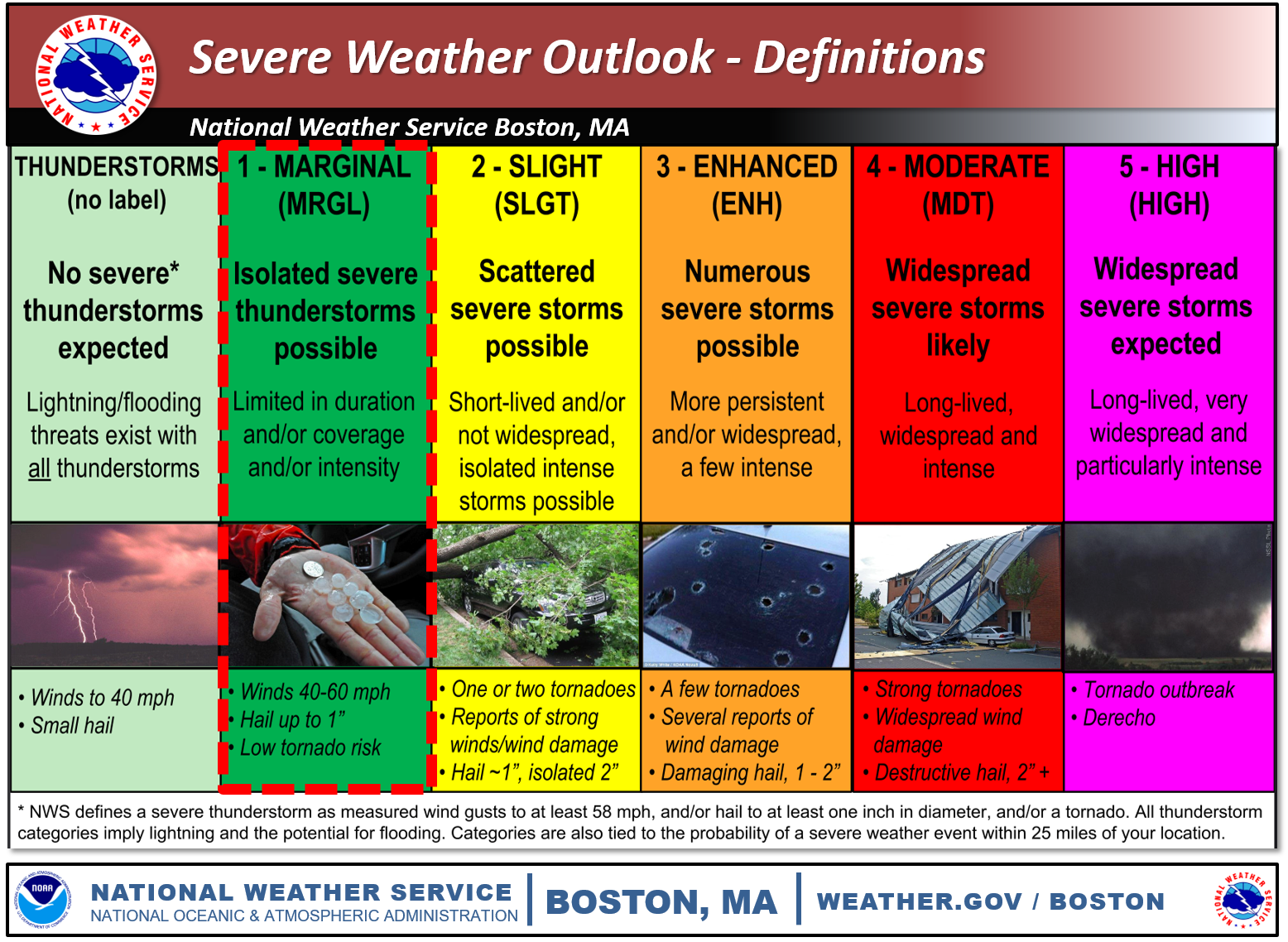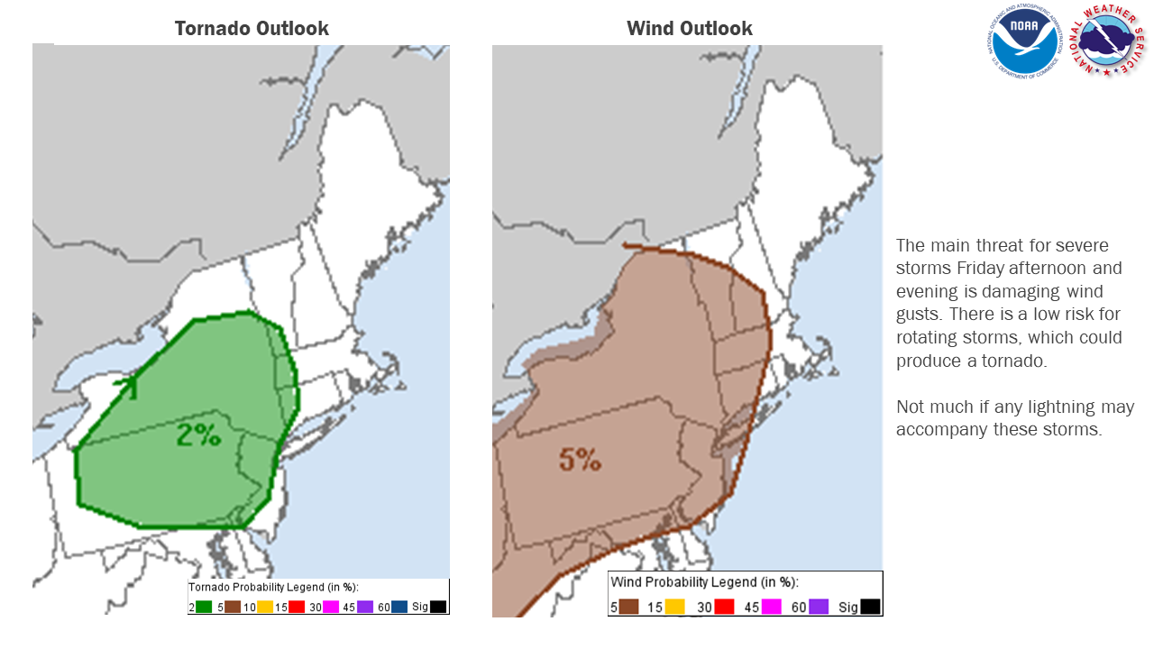 Good morning everyone, The forecast remains largely the same. A cold front will slide in from the west this afternoon and into the evening. Ahead of the front, a few severe thunderstorms may develop. Little if any lightning is expected with these storms. The biggest threat would be from damaging winds. There is also potential for a coastal storm to impact southern New England Monday into Tuesday with accumulating snow possible. Details on that will come into focus over the weekend. *What:* - A few severe thunderstorms are possible with the main threats of: - Damaging Wind Gusts - Heavy Downpours - Low risk of a tornado *When and Where:* - Friday afternoon and into the evening. Roughly between 4-8 PM. - Between 4-6 PM western MA and CT - Between 6-8 PM RI and eastern MA if storms hold together *Uncertainty:* - Showers may develop during the morning into the early afternoon, which could inhibit storms from becoming strong The graphics attached are the severe thunderstorm outlook for southern New England for March 20, 2020, hazards expected, and a reminder of the SPC Severe Weather Outlook definitions. Thank you Meteorologist: Bryce Williams If you have any questions or would like more information, don't hesitate to contact us via this email address, on NWSChat <https://nwschat.weather.gov/>, or at the following: National Weather Service Boston/Norton, MA 46 Commerce Way Norton, MA 02766 508.622.3280 Website <http://www.weather.gov/boston> | Facebook <http://www.facebook.com/NWSBoston> | Twitter <http://www.twitter.com/NWSBoston>