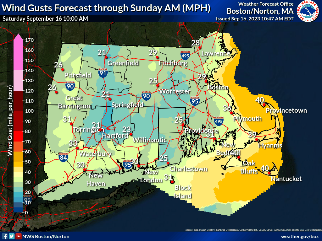 Good morning, The tropical storm warnings for coastal MA, Cape Cod, and the Islands have been dropped. Winds and wind gusts are now sub Tropical Storm force and will continue to gradually weaken this afternoon and evening. Winds will remain gusty for most of the day with gusts up to 35 mph expected near the coast. Please see the attached wind gust forecast loop for details on when we expect the gusty winds to diminish. Also, a coastal flood advisory is in effect for the north facing side of Cape Cod and Nantucket for the afternoon high tide today. Thank you, Meteorologists Rob Megnia, Torry Dooley, Matt Doody, and Andy Nash If you have any questions or would like more information, please don't hesitate to contact us. You can reach us via: email: box.operations@noaa.gov phone: 508.622.3280 Slack/NWSChat 2.0 <https://nwschatws.slack.com/> (for approved partners) social media: Website <http://www.weather.gov/boston> | Facebook <http://www.facebook.com/NWSBoston> | Twitter <http://www.twitter.com/NWSBoston>