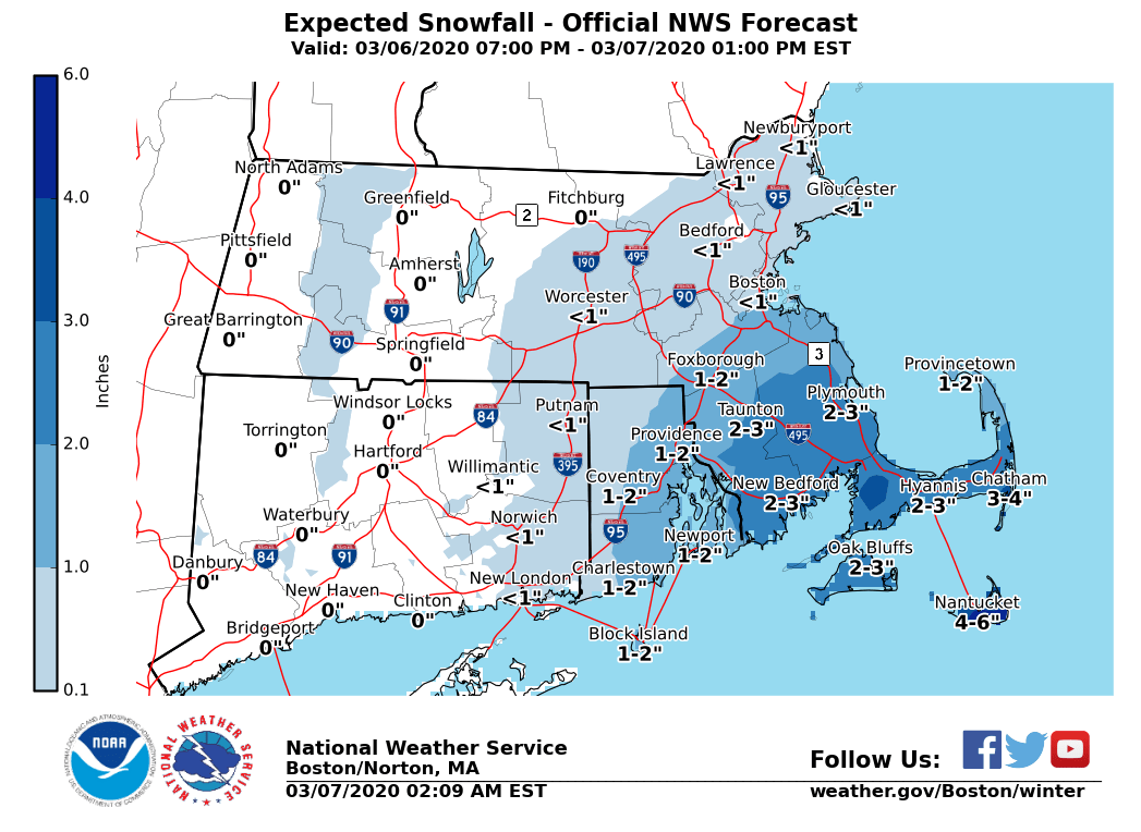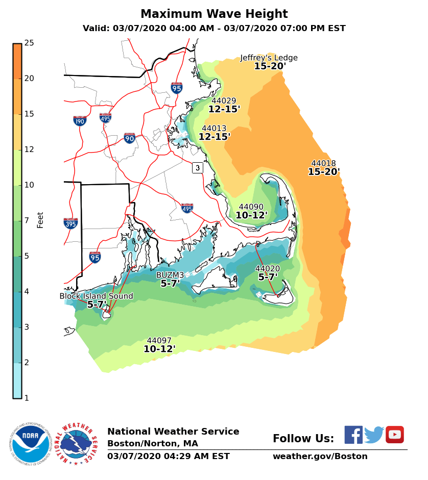 Good morning, A strong ocean storm will lift to the east and northeast of Cape Cod this morning. Strong winds will persist until late this morning across coastal areas, especially Cape Cod, Martha's Vineyard and Nantucket. Ocean areas will have strong winds and high seas. Snow will gradually taper off from west to east this morning across southeast MA, Cape Cod and the Islands. Weather related headlines and specifics are listed below. In addition, the attached images include storm total snow, maximum wind gust in miles per hour (MPH) on land, and maximum wave heights in feet for the coastal waters. *Headlines and locations:* - *High Wind Warning* for Cape Cod, Martha's Vineyard and Nantucket through noon today - *Wind Advisory* for Block Island, coastal Essex County, eastern Norfolk County and all of Plymouth County through noon today - *Storm Warning *in effect for most of the coastal waters south/east of MA - *Gale Warning* for Boston Harbor, Massachusetts Bay and Ipswich Bay, Block Island Sound, Narragansett Bay and coastal waters south of RI - *Winter Weather Advisory* for Cape Cod, Martha's Vineyard and Nantucket until 11 AM today - *Coastal Flood Advisory *for high tide this morning along all of east coastal MA, Cape Cod, Martha's Vineyard and Nantucket *What:* - North winds of 15 to 35 mph with gusts of 50 to 65 mph. Speeds lessening as the morning progresses - Tides running around 2 feet above normal. Minor coastal flooding is expected with coastal erosion possible - Storm total snowfall of 2-4 inches on Cape Cod and Martha's Vineyard, 3-5 inches expected on Nantucket *When:* - Wind speeds diminishing this morning, remaining breezy throughout the day - High tide this morning brings the greatest risk of coastal flooding and erosion - Snow tapering off this morning This will be the last briefing. Thank you, Meteorologists Frank Nocera and Bill Leatham If you have any questions or would like more information, don't hesitate to contact us via this email address, on NWSChat <https://nwschat.weather.gov/>, or at the following: National Weather Service Boston/Norton, MA 46 Commerce Way Norton, MA 02766 508.622.3280 Website <http://www.weather.gov/boston> | Facebook <http://www.facebook.com/NWSBoston> | Twitter <http://www.twitter.com/NWSBoston>