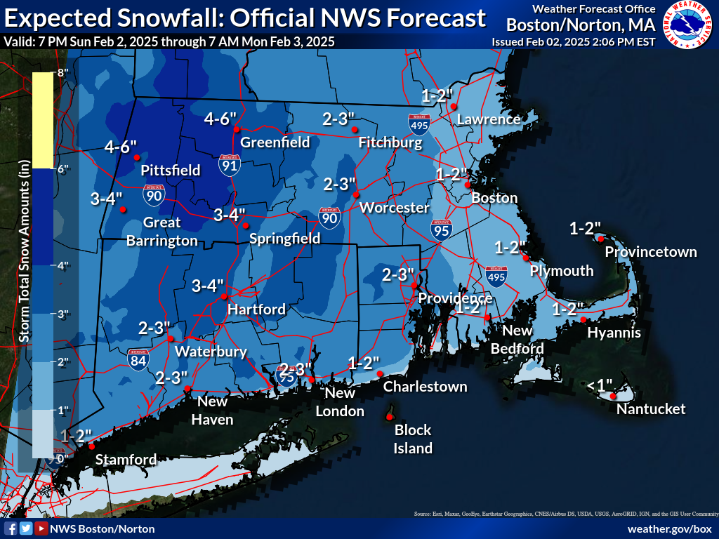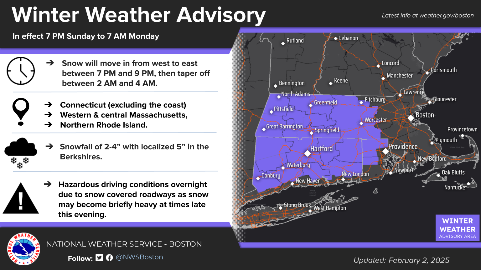 Good afternoon, We wanted to provide an update on a fast-moving system that will bring widespread snow to the region this evening, prompting a Winter Weather Advisory for most of Connecticut (excluding the coast), western and central Massachusetts, and northern Rhode Island. In these areas, we expect 2-4 inches of snow, with locally higher amounts near 5 inches in the Berkshires. Coastal areas and eastern Massachusetts will see 1-2 inches of snow. The Winter Weather Advisory is in effect from 7 PM Sunday to 7 AM Monday. Snow will move in from west to east between 7 PM and 9 PM, then taper off between 2 AM and 4 AM. Attached are the one-page briefing, a forecast snowfall map, and the current Winter Weather Advisory map. We are only expecting minor impacts to the Monday morning commute. This will be the final briefing. - Kevin Cadima and Torry Dooley If you have any questions or would like more information, please don't hesitate to contact us. You can reach us via: email: box.operations@noaa.gov phone: 508.622.3280 Slack/NWSChat 2.0 <https://nwschatws.slack.com/> (for approved partners) social media: Website <http://www.weather.gov/boston> | Facebook <http://www.facebook.com/NWSBoston> | Twitter <http://www.twitter.com/NWSBoston>