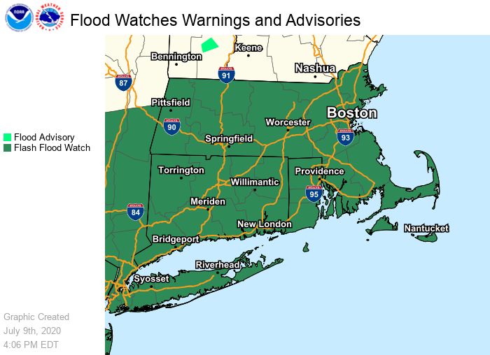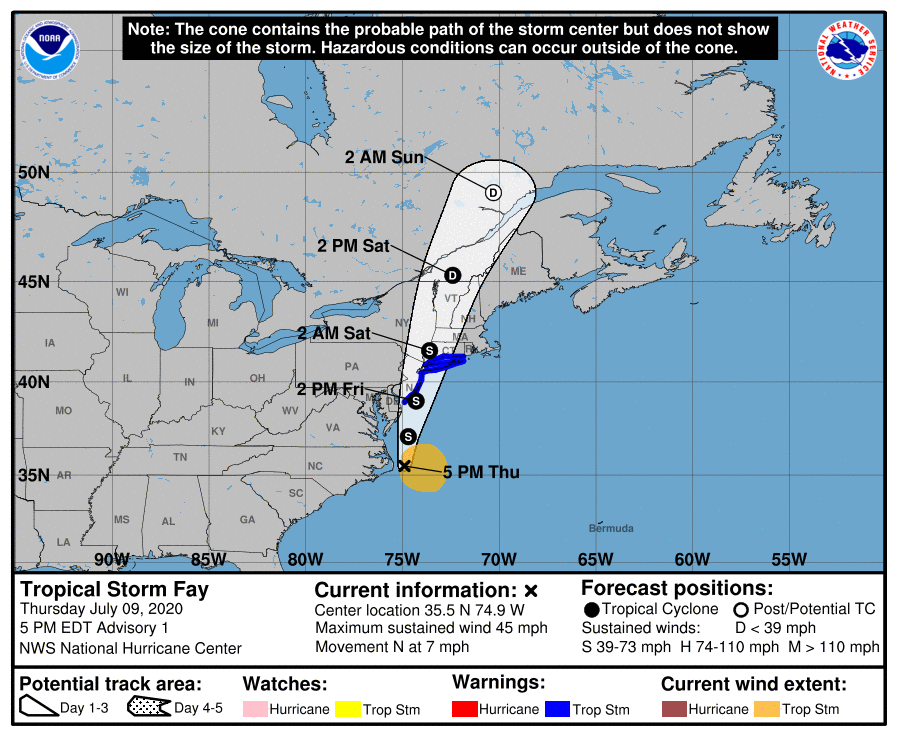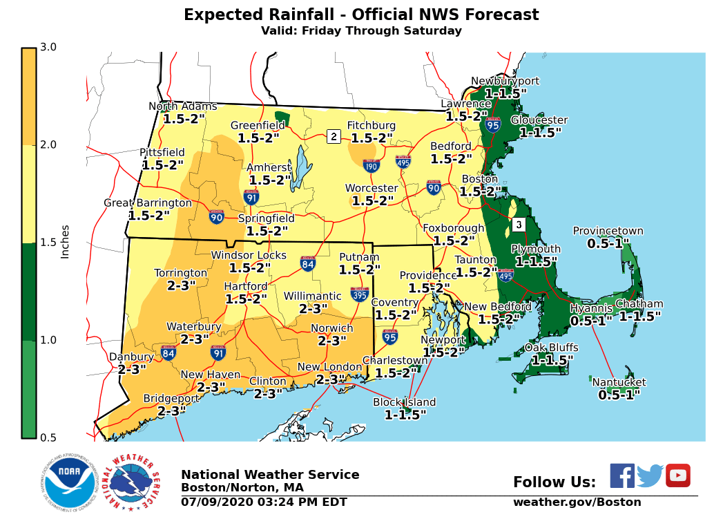 Good Afternoon Everyone, The following changes have been made to the forecast: *- Tropical Storm Warning issued for the Connecticut coast.* *- Flash Flood Watches issued for all of Connecticut, Massachusetts, and Rhode Island from Friday afternoon into Saturday morning.* Tropical Storm Fay has formed off the coast of North Carolina. It is forecast to track north and pass over western Long Island and western Connecticut Saturday morning. *The main concern from Fay in southern New England is the potential for flash flooding from heavy rainfall Friday night into Saturday. * Here are the key points regarding the main threats from Fay: *Flash Flooding:* We are most confident in the potential for heavy rainfall Friday night into Saturday morning. Rainfall of 1 to 2 inches is likely with locally higher amounts. Minor urban flooding is likely but more significant urban and small stream flooding is possible depending on where the heaviest rain falls. *Wind:* While it is more likely that sustained tropical storm force winds remain along the Connecticut coast, it is still possible that the track of Fay shifts east in later forecast, which could bring tropical storm force winds to the Rhode Island coast and adjacent waters. Prevailing wind direction should be from the south or southeast. *Rip Currents:* There is a moderate to high risk of rip currents Friday through Sunday on south coastal beaches. *Severe Weather:* There is the threat for an isolated severe thunderstorm, and with that a tornado is possible. The next email briefing will be sent early Friday morning. If you have any questions or would like more information, don't hesitate to contact us via this email address, on NWSChat <https://nwschat.weather.gov/>, or by phone at 508.622.3280. Thanks, Joe DelliCarpini