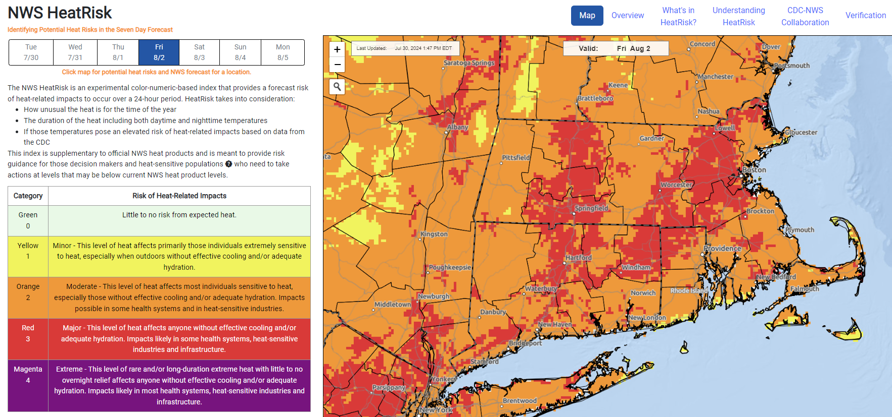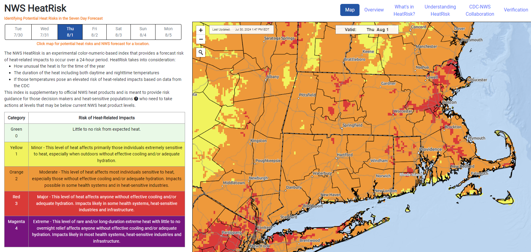 Good Afternoon Everyone, Attached is a one-page briefing and related images regarding the return of heat and humidity to southern New England Thursday and Friday. Later forecasts will probably include the issuance of Heat Advisories for at least parts of the area. The exception would most likely be the immediate South Coast, Cape Cod, and the Islands where onshore winds will keep it a little cooler (but it will still be warm and humid). You can also refer to the NWS Heat Risk page <https://www.wpc.ncep.noaa.gov/heatrisk/> for potential heat impacts. If you have any questions or would like more information, please don't hesitate to contact us. You can reach us via: email: box.operations@noaa.gov phone: 508.622.3280 Slack/NWSChat 2.0 <https://nwschatws.slack.com/> (for approved partners) social media: Website <http://www.weather.gov/boston> | Facebook <http://www.facebook.com/NWSBoston> | Twitter <http://www.twitter.com/NWSBoston> Thanks, Joe Dellicarpini and Torry Dooley