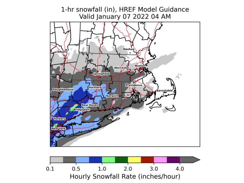 Good morning, Apologies for the previously unfinished email. To supplement the information provided in our previous email we've included on this email an animated loop of snowfall rates. This animation is model guidance and not the official forecast. It is meant to serve as a rough estimate as to when to expect the heaviest snowfall and where/when snowfall rates >1" per hour will be possible. Areas shaded in green represent snowfall rates >1 inch per hour. Thank you, Rob Megnia and Matthew Belk If you have any questions or would like more information, don't hesitate to contact us via this email address, on NWSChat <https://nwschat.weather.gov/>, or at the following: National Weather Service Boston/Norton, MA 46 Commerce Way Norton, MA 02766 508.622.3280 Website <http://www.weather.gov/boston> | Facebook <http://www.facebook.com/NWSBoston> | Twitter <http://www.twitter.com/NWSBoston>