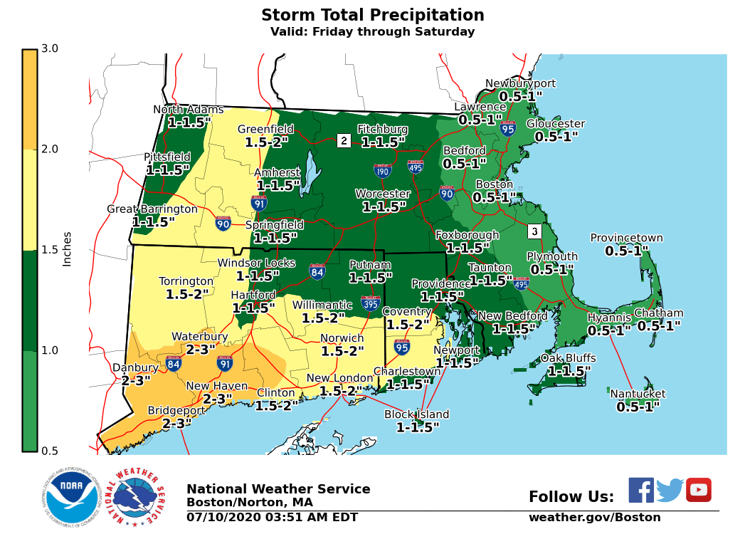 Good morning everyone, The following changes have been made to the forecast: *- Flash Flood Watch was taken down for eastern/central Massachusetts and Rhode Island. The best chance *of flooding issues may remain west of southern New England. Tropical Storm Fay is forecast to track north and pass over western Long Island and western Connecticut Saturday morning. The main concern from Fay in southern New England is the potential for flash flooding from heavy rainfall Friday night into Saturday in western MA and CT.* However, the best chance of flooding issues may remain west of southern New England. * Here are the key points regarding the main threats from Fay: *Flash Flooding:* We are most confident in the potential for heavy rainfall tonight in western MA and CT. Rainfall of 1 to 2 inches is likely with locally higher amounts. Minor urban flooding is possible but more significant urban and small stream flooding is possible depending on where the heaviest rain falls. *Wind:* It is likely that tropical storm force winds remain along the Connecticut coast. Prevailing wind direction should be from the south or southeast. *Rip Currents:* There is a moderate to high risk of dangerous rip currents and high surf Saturday, especially on south facing, ocean exposed beaches. *Severe Weather:* The overall severe weather threat is low, but an isolated tornado cannot be ruled out. The next email briefing will be sent this afternoon. If you have any questions or would like more information, don't hesitate to contact us via this email address, on NWSChat <https://nwschat.weather.gov/>, or by phone at 508.622.3280. Thanks, Bryce Williams and Hayden Frank National Weather Service Boston/Norton, MA 46 Commerce Way Norton, MA 02766 508.622.3280 Website <http://www.weather.gov/boston> | Facebook <http://www.facebook.com/NWSBoston> | Twitter <http://www.twitter.com/NWSBoston>