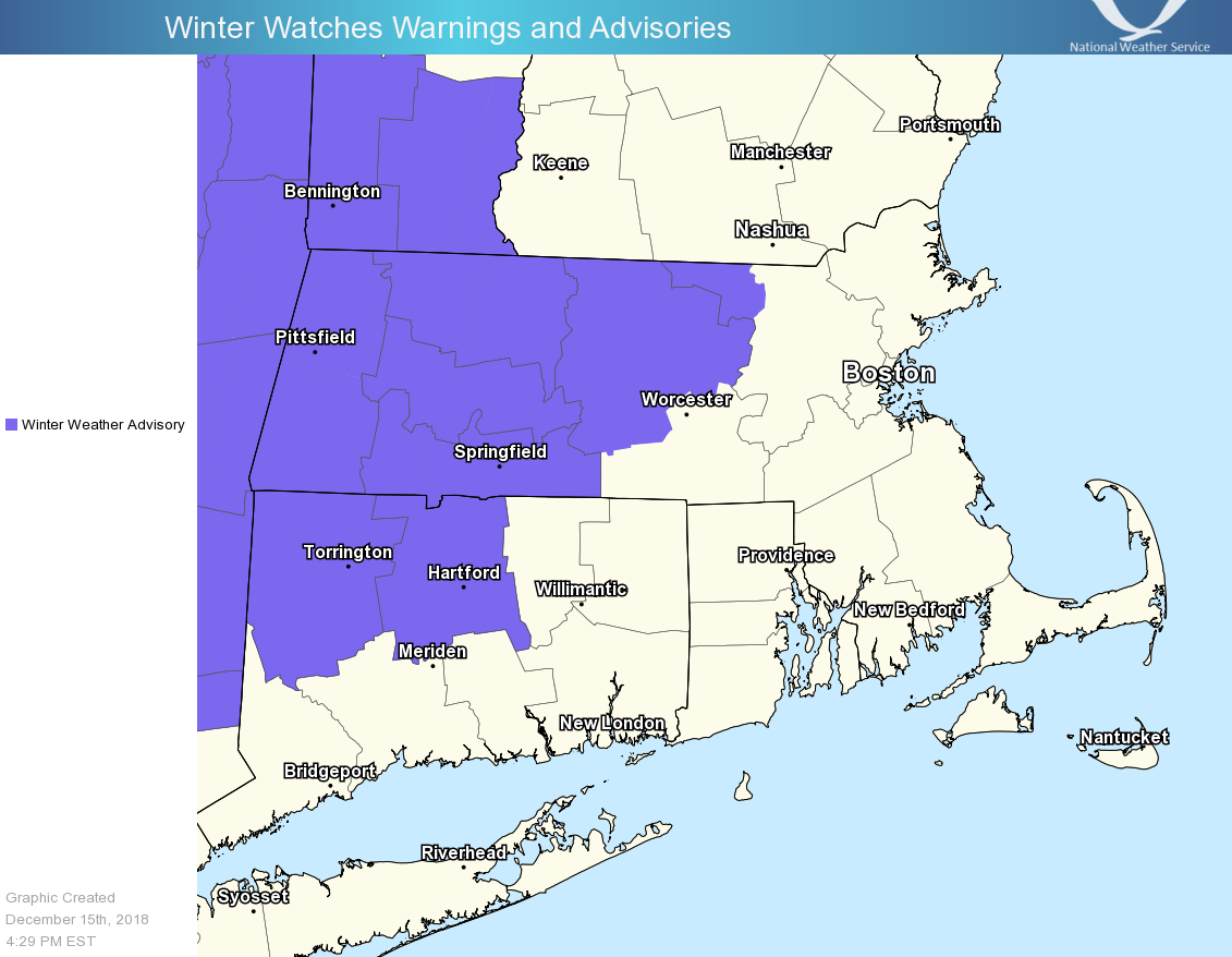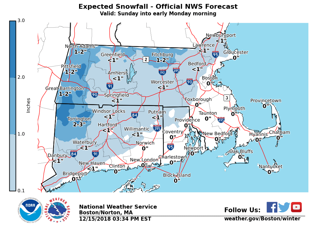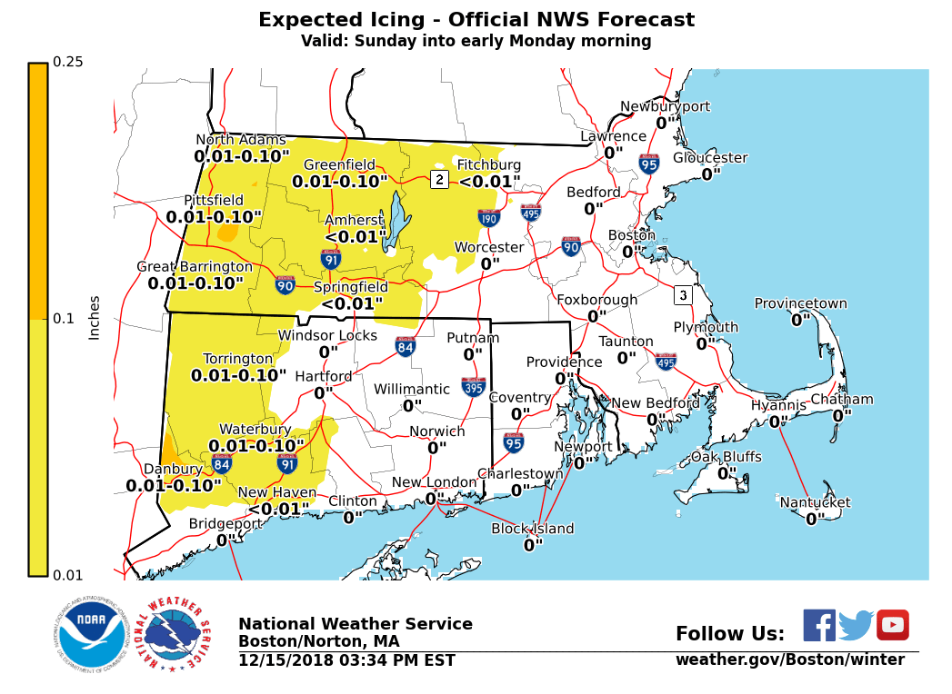 Good afternoon, A wintry mix of sleet and freezing rain for the interior is still forecast Sunday then changing to mainly snow Sunday night into early Monday. Please see the attached images that highlight the latest forecast thinking and possible trends. *What / Where / When ...* - Wintry mix of sleet / freezing rain across northwest CT into central-western MA - Onset early Sunday morning for northwest CT but likely not until afternoon for central-western MA - Low risk for spotty light freezing drizzle across northern CT into Worcester county Sunday morning - Minor snow / sleet accumulations of a coating up to 2 inches are forecast, as well as ice accretion of a trace up to a tenth of an inch - Greatest travel impacts in regards to slick roadways will be across the higher terrain especially elevations above 1000 ft - Sleet and Freezing rain changes to snow Sunday night from western CT/MA eastward - Greatest impact Sunday night into the Monday morning commute will likely be across the higher elevations where temperatures are at or below freezing - Therefore not expecting much if any snow accumulations into the Hartford-Providence-Boston corridor with roads possibly just wet *Uncertainty ...* Given a mixed precipitation event, there remains uncertainty with respect to precip-types at specific times over particular areas, as well as associated outcomes and impacts. As of now the greatest impact appears across the higher elevations of northwest CT into western-central MA. Thus little if any impact to the Hartford-Providence-Boston corridor. However if the storms intensifies more rapidly than expected wintry precipitation may occur farther south and east. There will likely be adjustments to later forecasts so stay tuned to further emails. Should you have any questions, comments and/or concerns, please don't hesitate to reach out to us at any time. Frank Nocera If you have any questions or would like more information, don't hesitate to contact us via this email address, on NWSChat <https://nwschat.weather.gov/>, or at the following: National Weather Service Boston/Norton, MA 46 Commerce Way Norton, MA 02766 508.622.3280 Website <http://www.weather.gov/boston> | Facebook <http://www.facebook.com/NWSBoston> | Twitter <http://www.twitter.com/NWSBoston>
