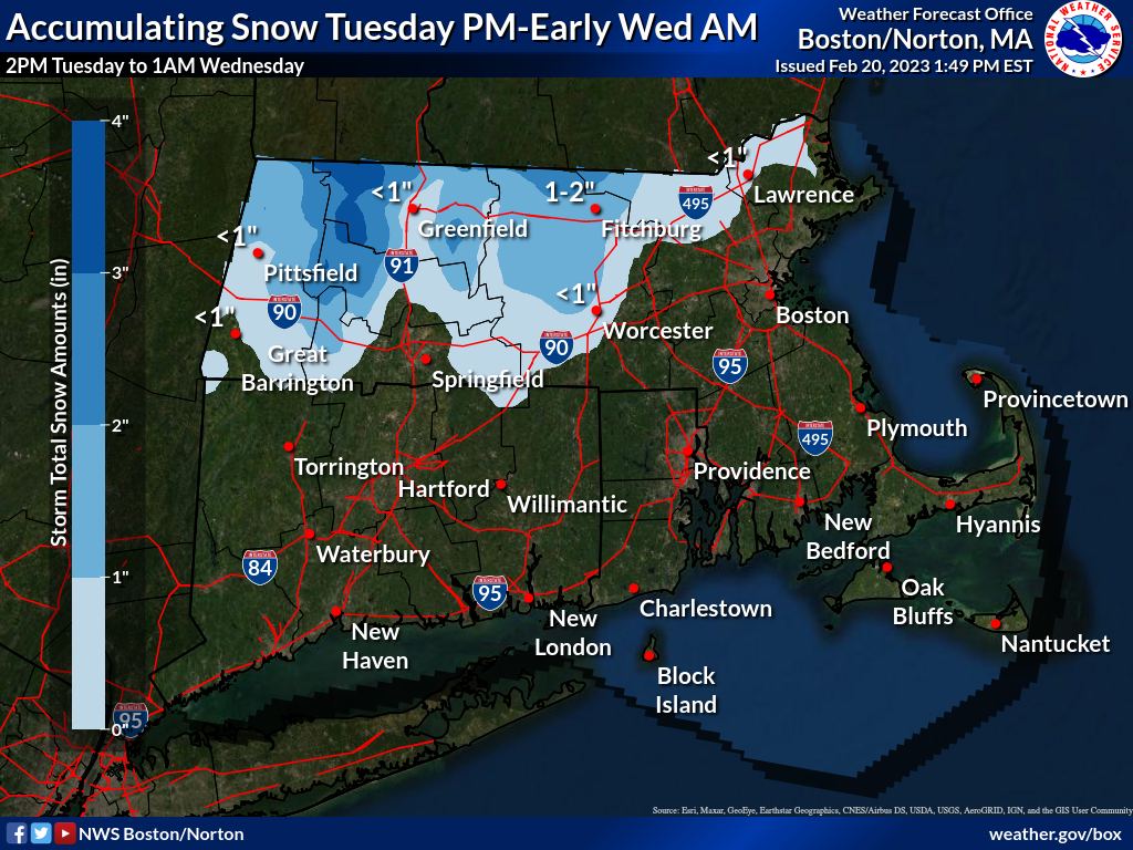 Good afternoon, We are looking at a fairly active period of weather for the workweek, with multiple periods of wintry weather to contend with. We have two generally minor/nuisance events, overnight tonight into Tuesday morning and another for Tuesday late afternoon into Tuesday night. However a more significant winter storm then looks to affect Southern New England Wednesday night through Thursday night involving accumulating snow, sleet and freezing rain. It is this latter storm system which has the greatest concern for widespread wintry weather impacts this week. Each storm will be discussed below: *Storm #1: Overnight into Early Tuesday AM [CT, RI and Southeast MA] * A weak and fast-moving low pressure moving across our southern coastal waters overnight tonight into early Tuesday morning to spread steady light snow (or brief rain at the onset then changing to steady light snow) across Connecticut, Rhode Island and into southeast Massachusetts. While snow accumulations with this fast-moving storm are limited to no more than 2 inches, snow will be falling during the morning commute and could pose difficult travel for commuters during the Tuesday morning commute, including reduced visibility and possible slushy, slippery roads. Image below shows our latest snow forecast for overnight tonight into Tuesday morning: [image: snowtues.png] *Confidence*: High confidence on snow occurring, but lower on the northern extent of minor accumulations and the total accumulations. Much of what falls will be on grassy surfaces, with slushy accumulation on paved surfaces. *Storm #2: Tuesday Late Afternoon to Tuesday Night [Mainly North and West of I-495]* The next fairly weak and fast-moving storm then moves in later Tuesday afternoon into Tuesday night. While mainly plain rain is anticipated for Connecticut, Rhode Island and eastern and southeast Massachusetts, temperatures should be cold enough for minor accumulating snow in the Merrimack Valley, central Massachusetts and into the Berkshires in western Massachusetts. Coatings to up to 2 inches of new snow appear to be common, with local/isolated amounts up to 4 inches in the Berkshires. We expect accumulating snow to end shortly after midnight. Following image is our snowfall expectations for Tuesday late afternoon to Tuesday night: [image: snowtueswed.png] *Confidence: *High on the event occurring, but moderate on the total accumulations. Greatest accumulation potential mainly in the higher terrain. Snow will likely be wet and slushy. *Storm #3: Wednesday Night through Thursday Night [All of Southern New England, but especially along and north of Interstate 95]. * A stationary front lying in the vicinity of Southern New England to lift northward Wednesday night through Thursday night, bringing a mix of wintry precipitation types to the area. Forecast remains little changed from that which was briefed early this morning. Accumulations of snow, sleet and/or freezing rain are all possible, with the potential for adverse impacts. It still is too early to provide specific details on precipitation type changeovers and forecast accumulations as yet. Attached is our one-page briefing which was previously sent and remains valid at this time. *Confidence*: Moderate to high on the event occurring, but low on snow/sleet and ice amounts. Snow/sleet and ice amounts will be sensitive to small changes in temperatures and the storm's track, and thus could vary, perhaps significantly. Expect an update to this briefing *no later than Tuesday morning*. Thank You! Meteorologists: Kristie Smith, Torry Gaucher and Andrew Loconto If you have any questions or would like more information, don't hesitate to contact us via this email address, on NWSChat <https://nwschat.weather.gov/>, or at the following: National Weather Service Boston/Norton, MA 46 Commerce Way Norton, MA 02766 508.622.3280 Website <http://www.weather.gov/boston> | Facebook <http://www.facebook.com/NWSBoston> | Twitter <http://www.twitter.com/NWSBoston>